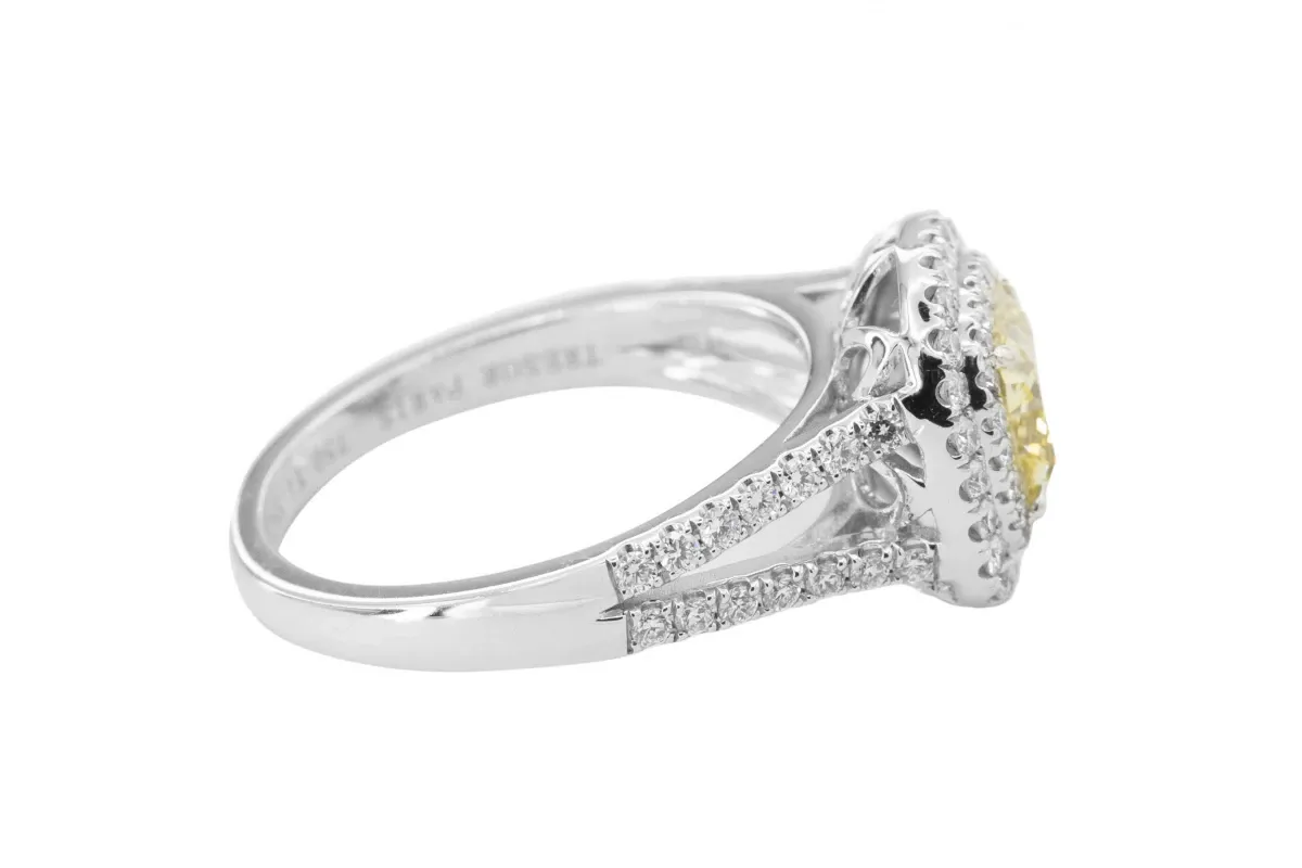 This exceptional natural yellow diamond engagement ring will certainly shine out against the crowd. The "Cushion modified Brilliant" solitaire diamond is a GIA certified "Fancy browish yellow" its carat weight is 1.55ct and is mounted in a beautifully crafted double halo & split shank ring mount. This Fancy colour diamond is exceptionally rare and has an even colour hue. The ring has a total ct weight of 2.15ct.