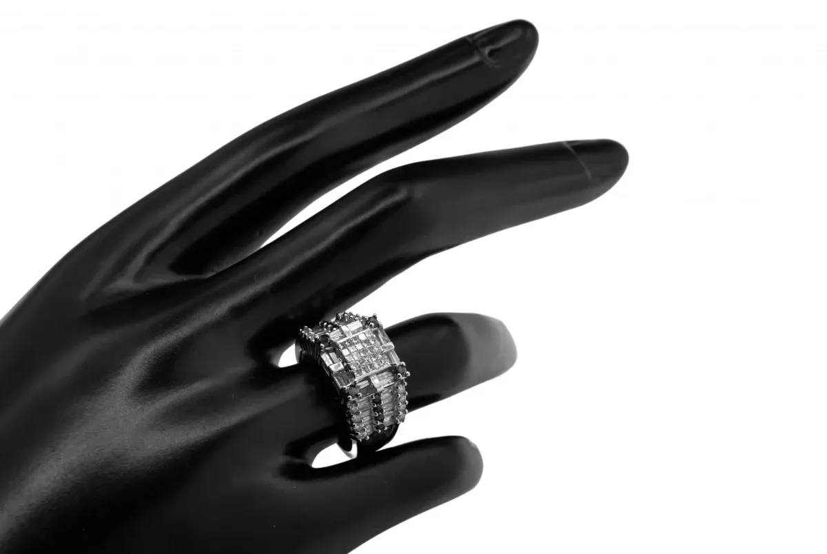An impressive 14ct white gold diamond cluster ring boastin round brilliant and baguette cut diamonds. With attractive black diamonds set inbetween, total diamond weight 2.50ct G colour SI diamonds.