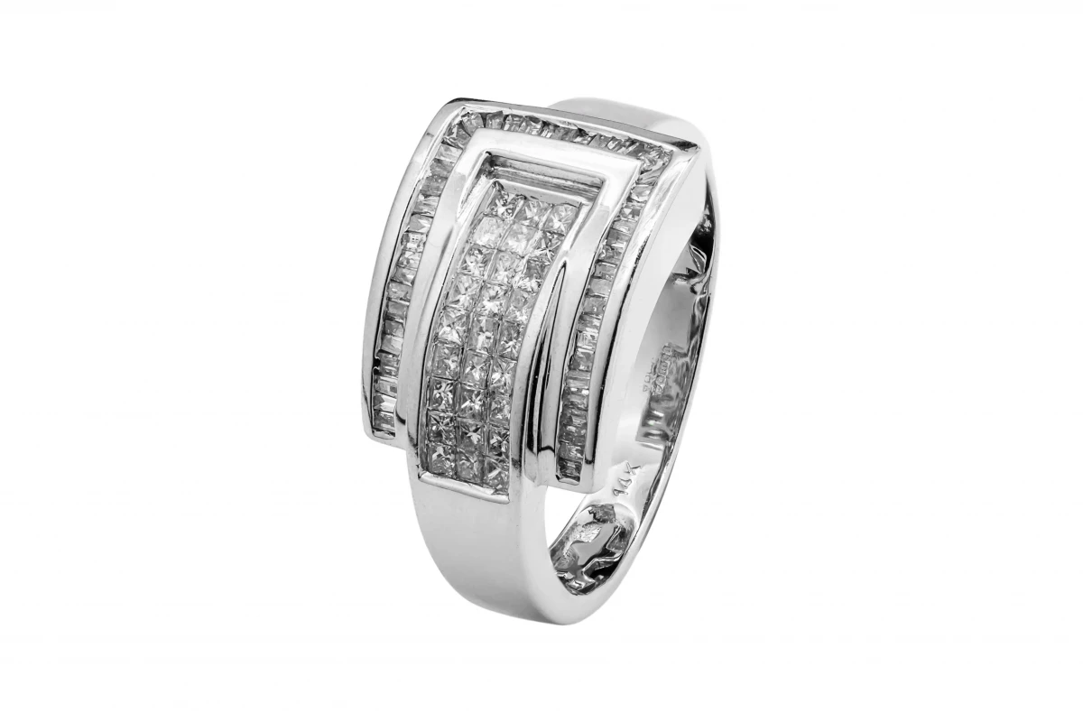 Crafted in 14ct white gold, this striking buckle-style ring features a combination of baguette and princess cut diamonds totalling 1.00ct for a bold and distinctive look.