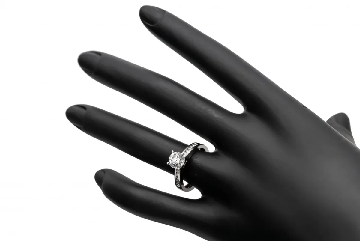 The round brilliant centre diamond is 1.23 carat while the 10 round cut brilliant diamonds on the shoulders are 0.30 carat.