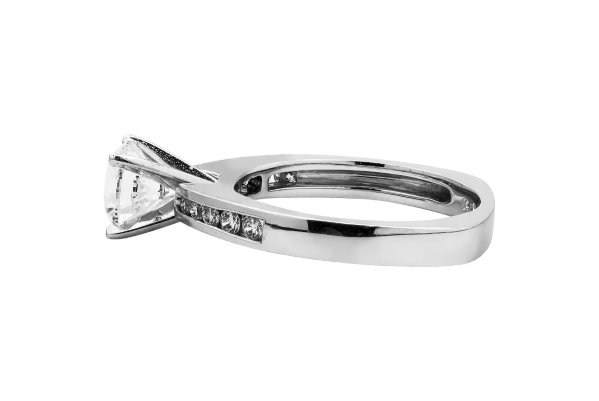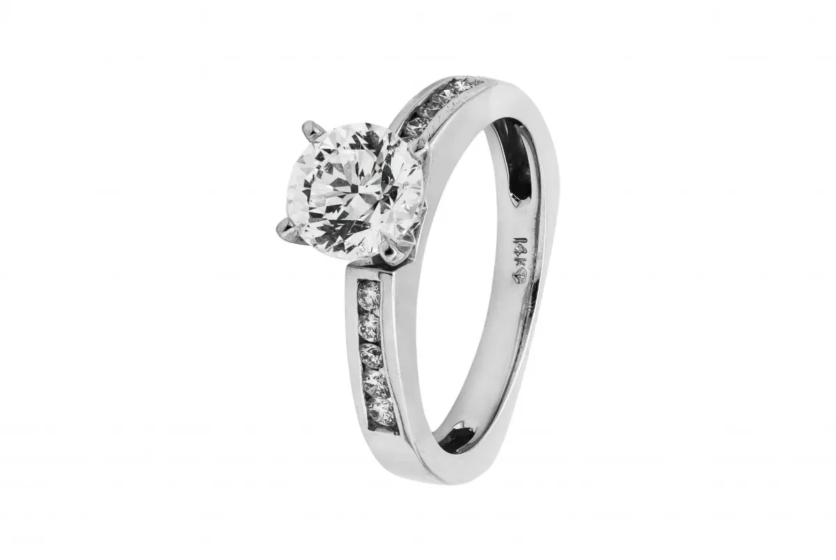 A 6 claw channel style engagement ring setting for a round brilliant diamond. The setting is available is 14ct white gold.