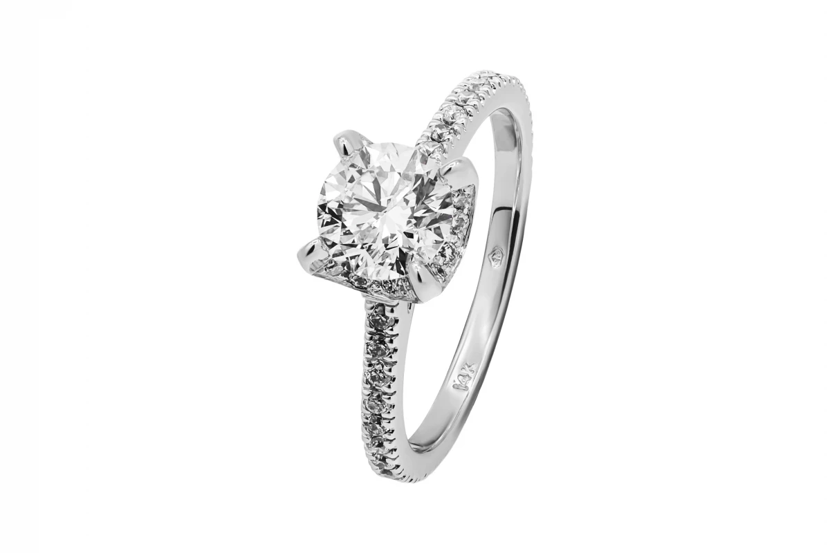 Crafted in 14ct white gold, this elegant engagement ring features a 0.91ct round brilliant cut centre diamond, graded H colour and SI1 clarity for exceptional sparkle.