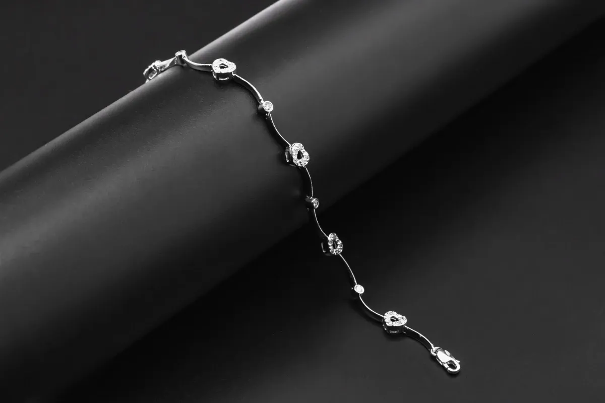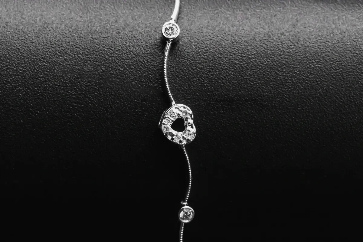 Weighing 5.4g and measuring 7.5 inches, this elegant bracelet showcases a delicate heart design, combining timeless romance with luxurious sparkle.