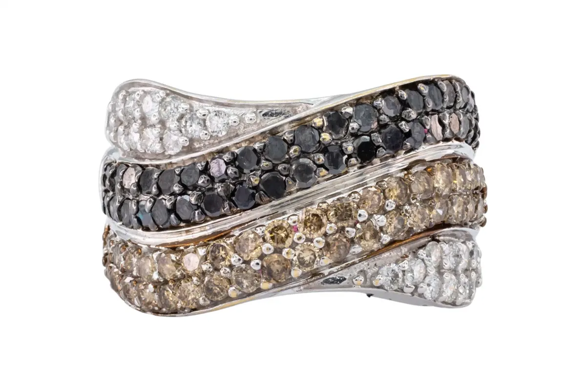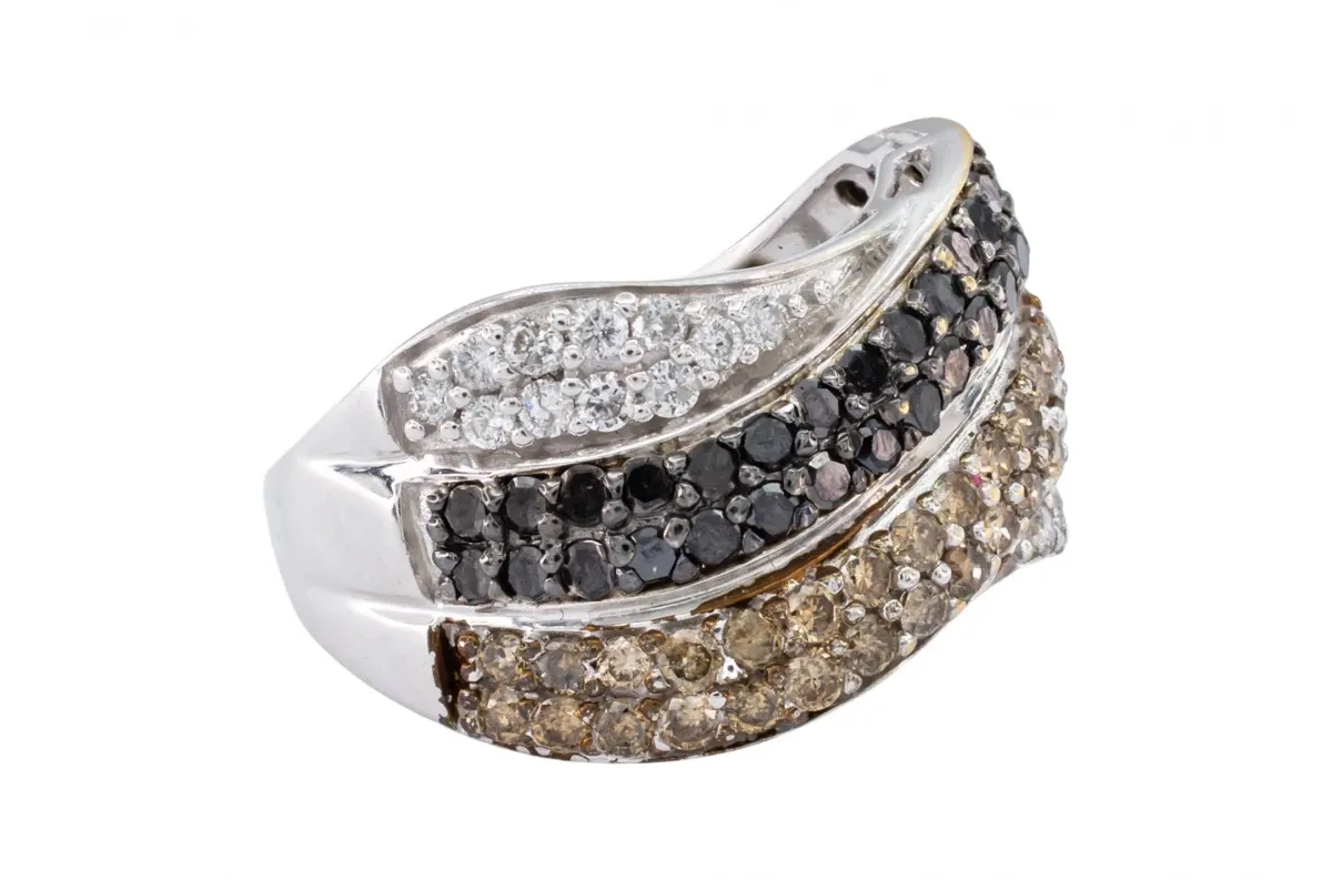 Crafted in 14ct white gold this pavé set black, champagne and white diamond ring has a very bold statement with its contrasting stone colours.