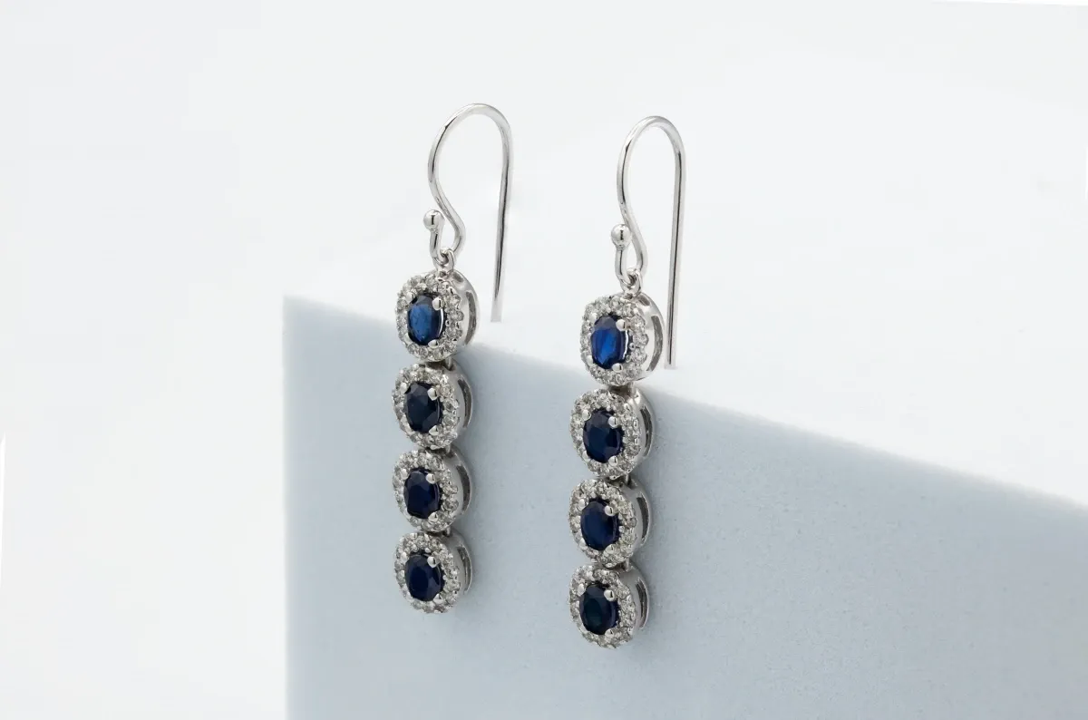 These spectacular diamond and sapphire hanging earrings are crafted in 14ct white gold, combining timeless elegance with vibrant colour.