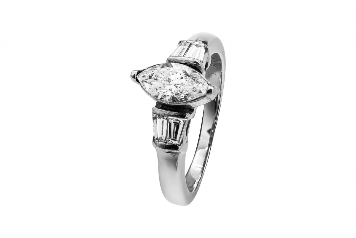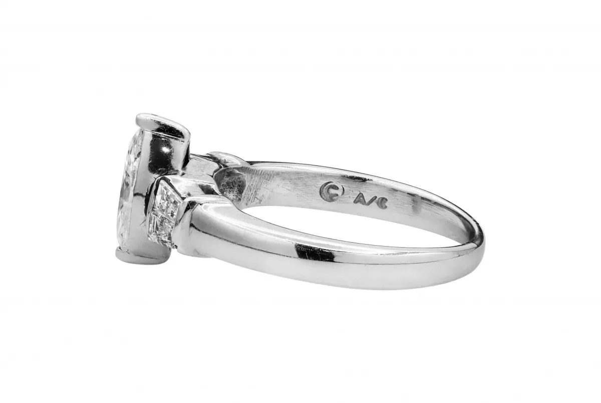 The ring also features additional emerald cut diamonds on the shoulders weighing 0.30 carats.