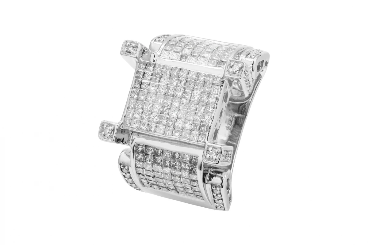 Designed with a striking square cluster head set with princess cut diamonds, this substantial piece delivers strong presence and refined luxury. A standout statement ring, perfect for those who appreciate high-impact design. Ring size O.