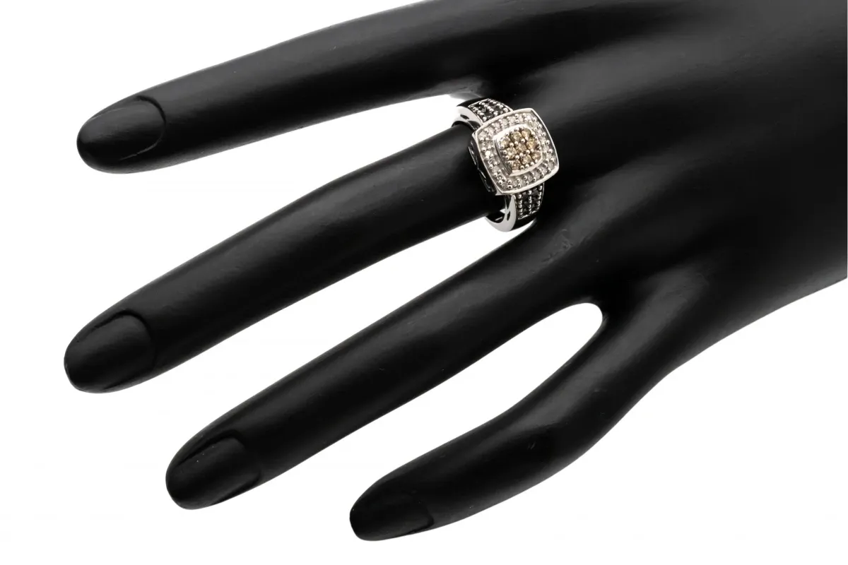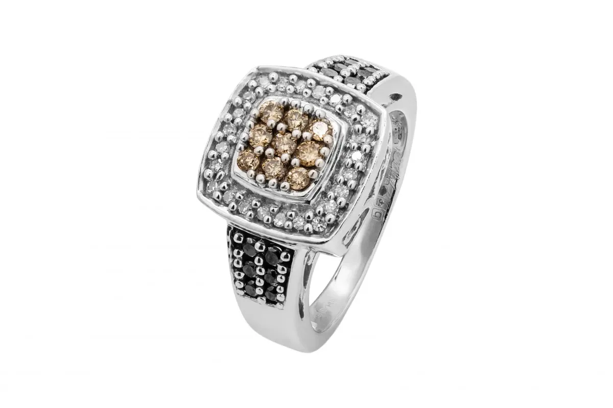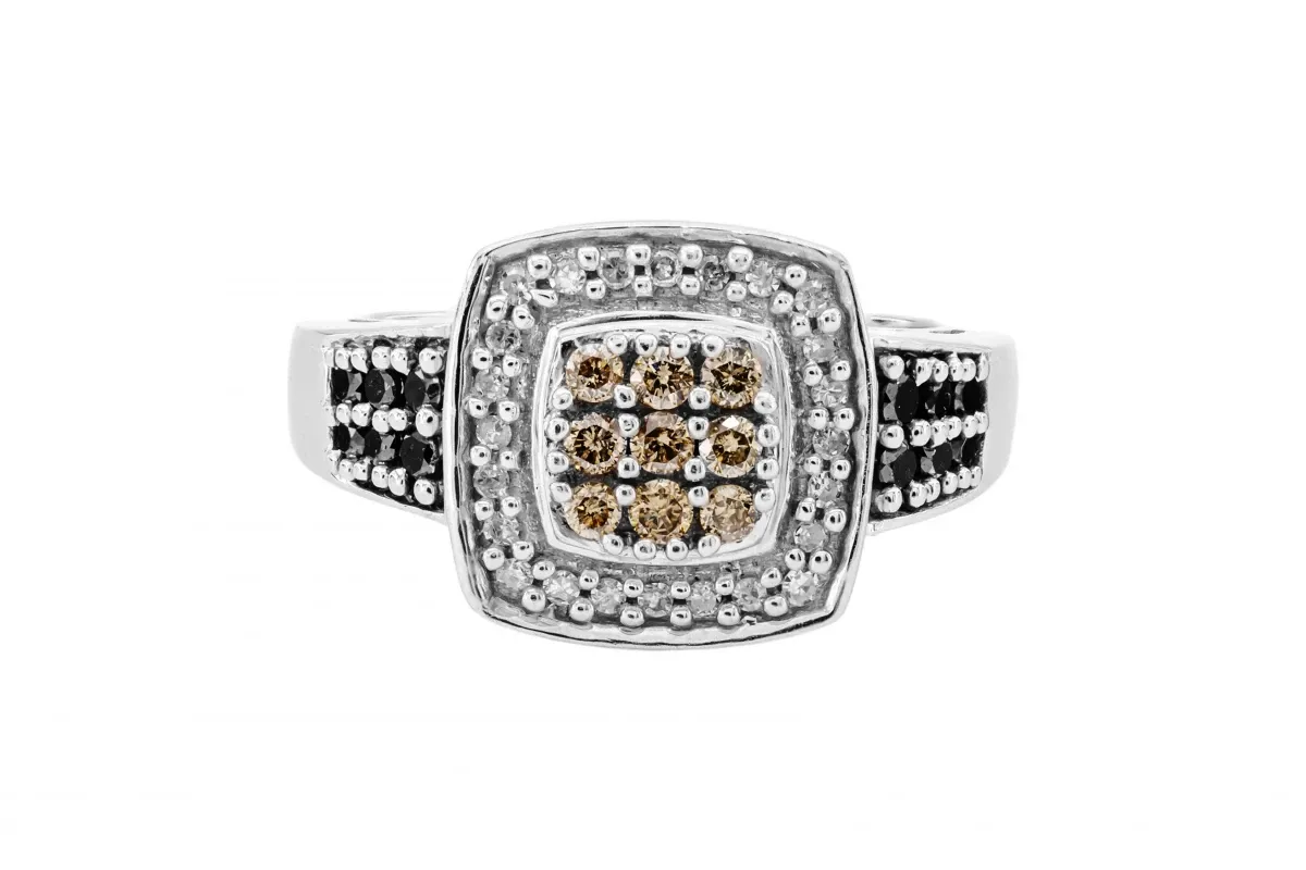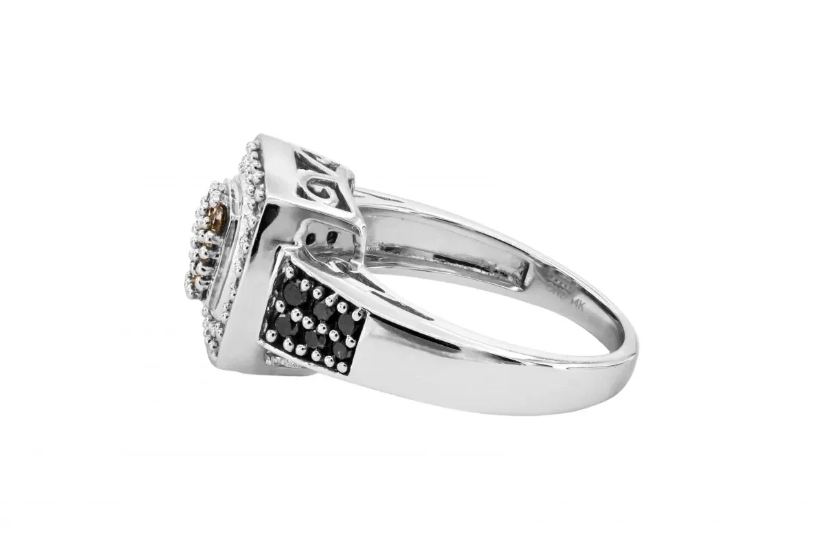 At the heart of this ring, a cluster of 9 cognac-colored diamonds, reminiscent of champagne, forms a radiant focal point. The surrounding halo, adorned with glistening white diamonds, creates a brilliant contrast that enhances the overall brilliance. To add a touch of intrigue and drama, the sides of the ring feature exquisite black diamonds, completing the trinity of captivating colors.