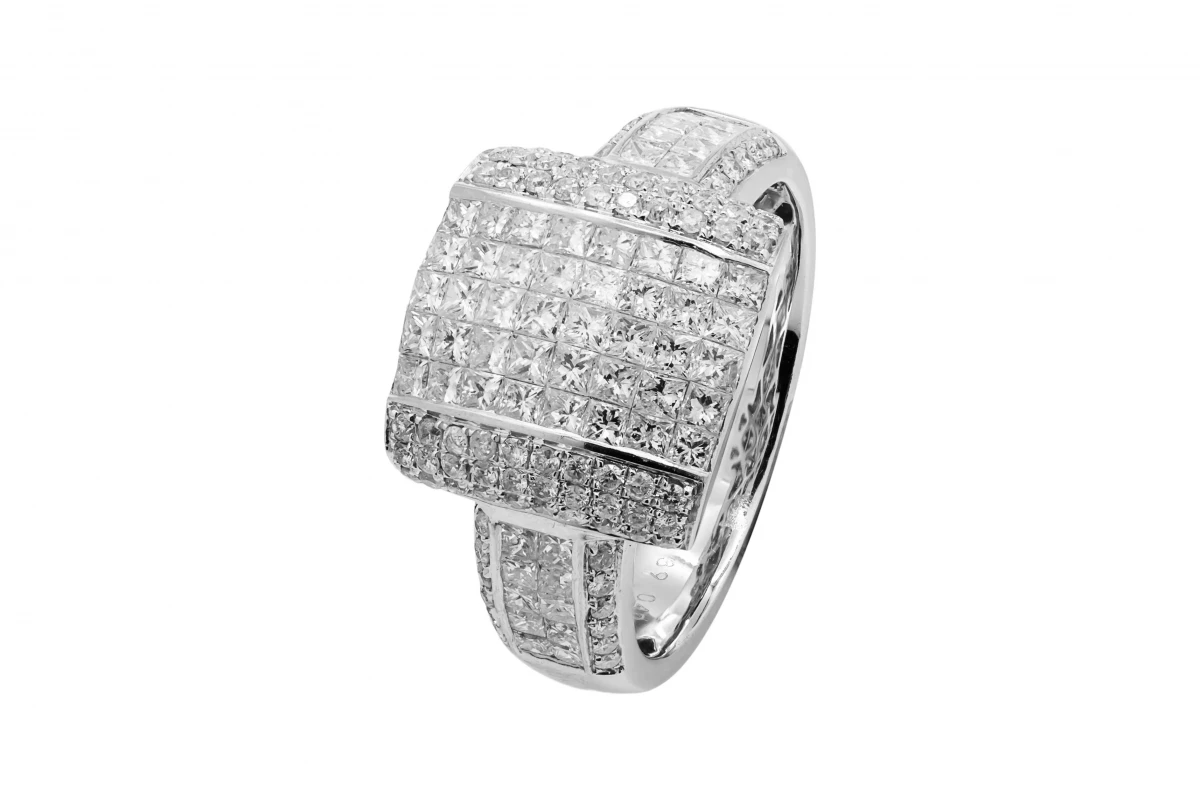 Crafted in 14ct white gold, this elegant ring features a central cluster of princess cut diamonds forming a striking square profile.
