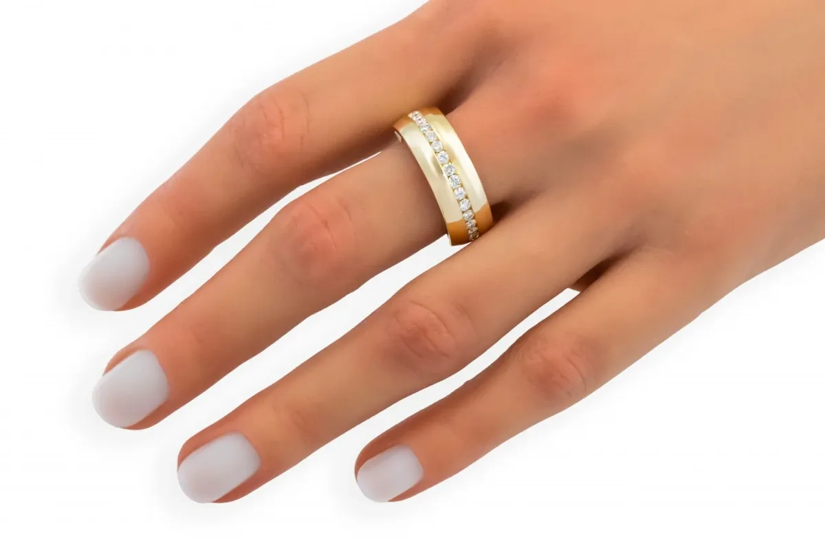 Sized at T½, the band combines classic gold with dazzling sparkle perfect for marking your special commitment with sophistication and style.