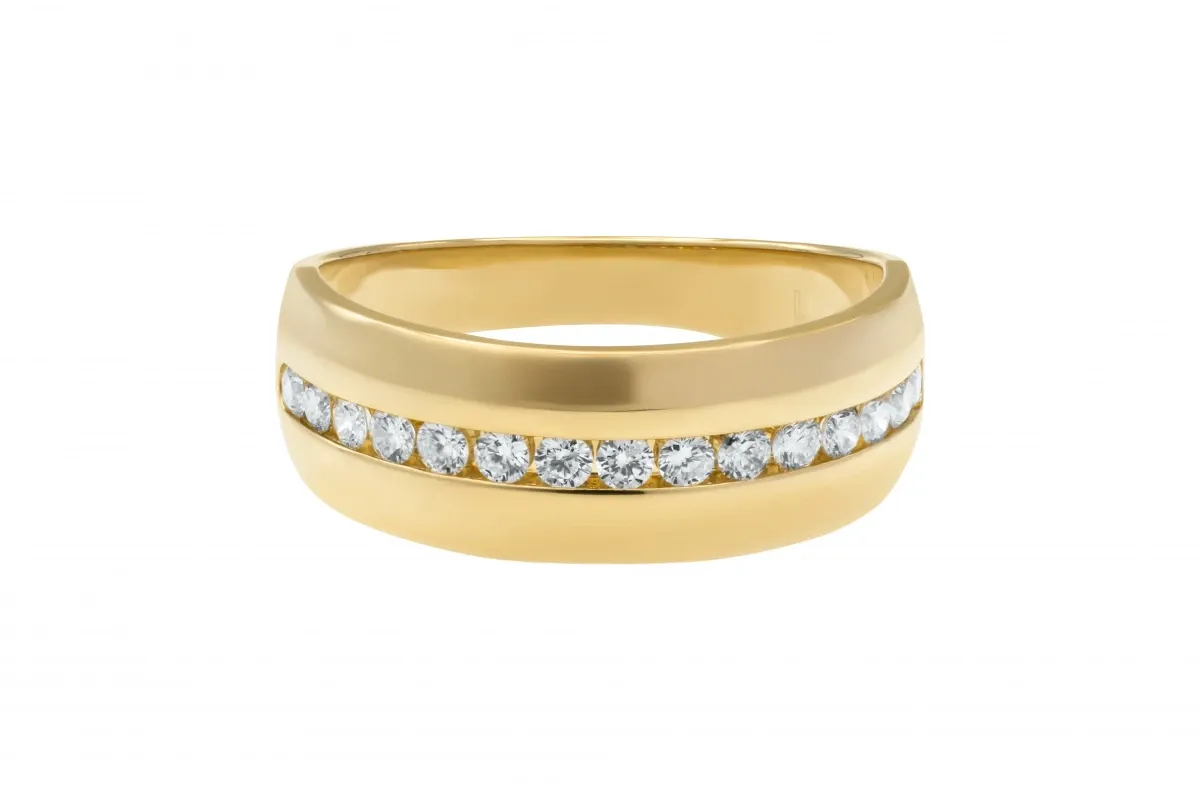 This bold and luxurious wedding band is crafted in 14ct yellow gold and set with a brilliant 0.74ct of natural diamonds.