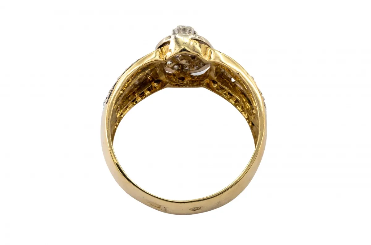 A wonderful cross-over ring in 14ct yellow gold featuring 1ct diamonds, this delightful design displays sparkling black and white diamonds.