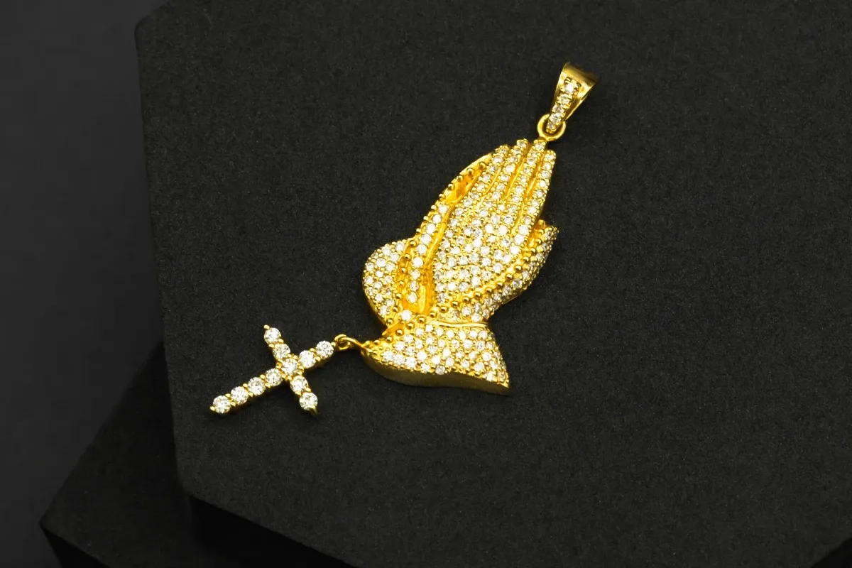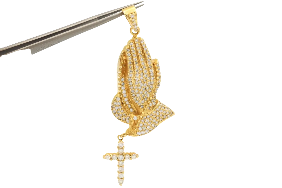 14ct Yellow Gold Diamond Pray Hands & Cross Pendant 3.16cts