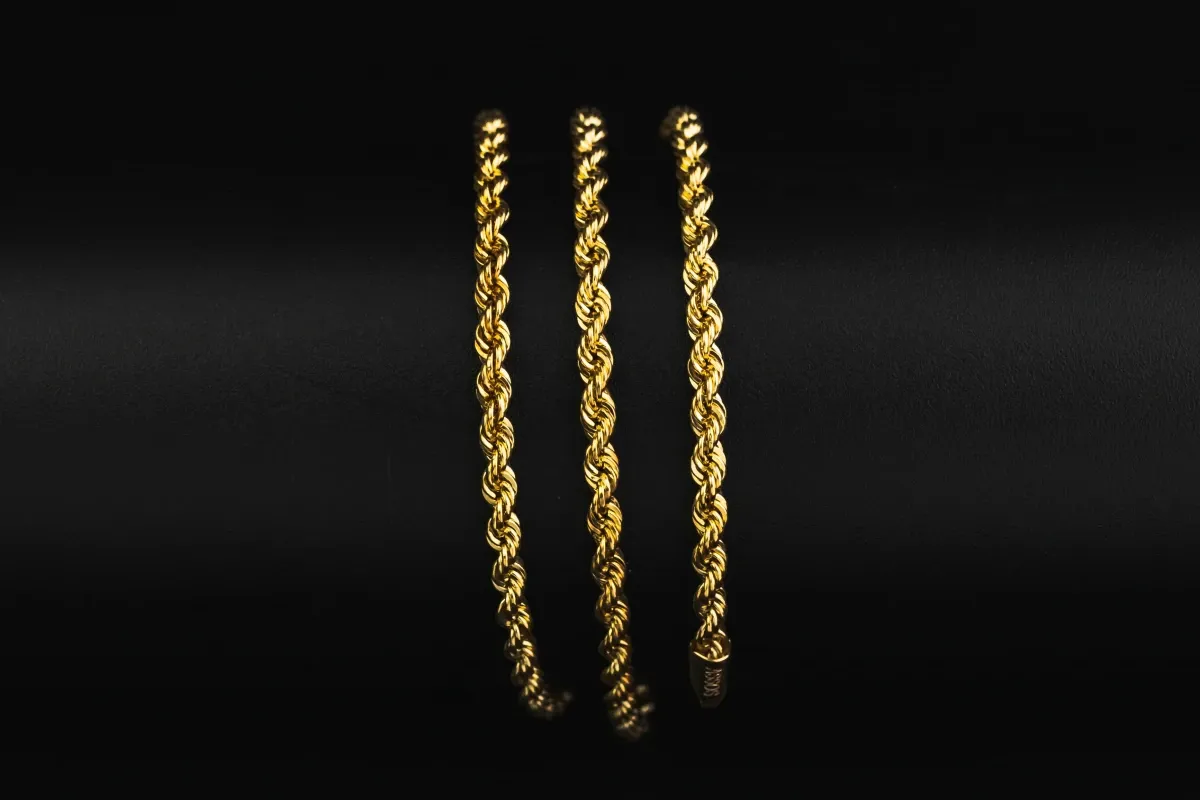 Add a luxurious touch to your collection with this stunning 14ct yellow gold rope chain. Measuring 18 inches in length with a 3mm thickness, it offers a bold yet classic look.