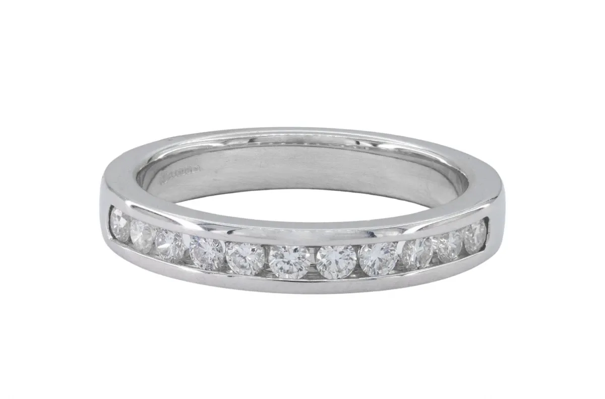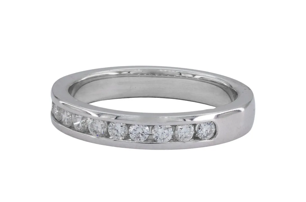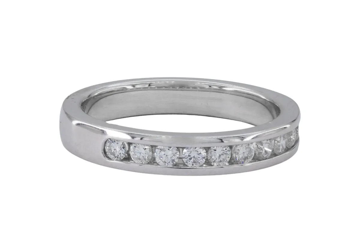 This 18ct white gold ring features a round brilliant cut 0.50cts diamond with F/G colour,vs clarity, weighs 4.5g and is a size L.