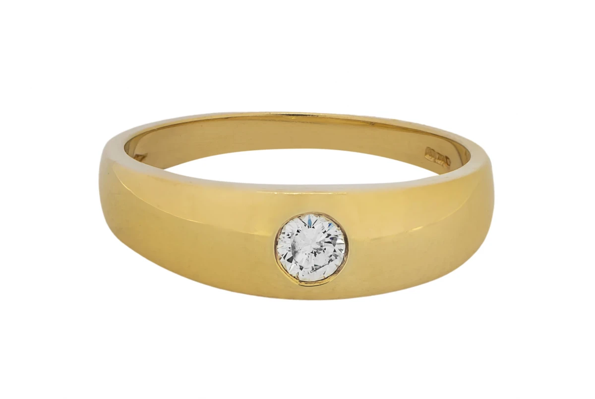 The spectacular yellow gold ring features a 0.25ct G/SI1 Quality Diamond which is held in a rubover setting and nestled within a large band of 18ct yellow gold.