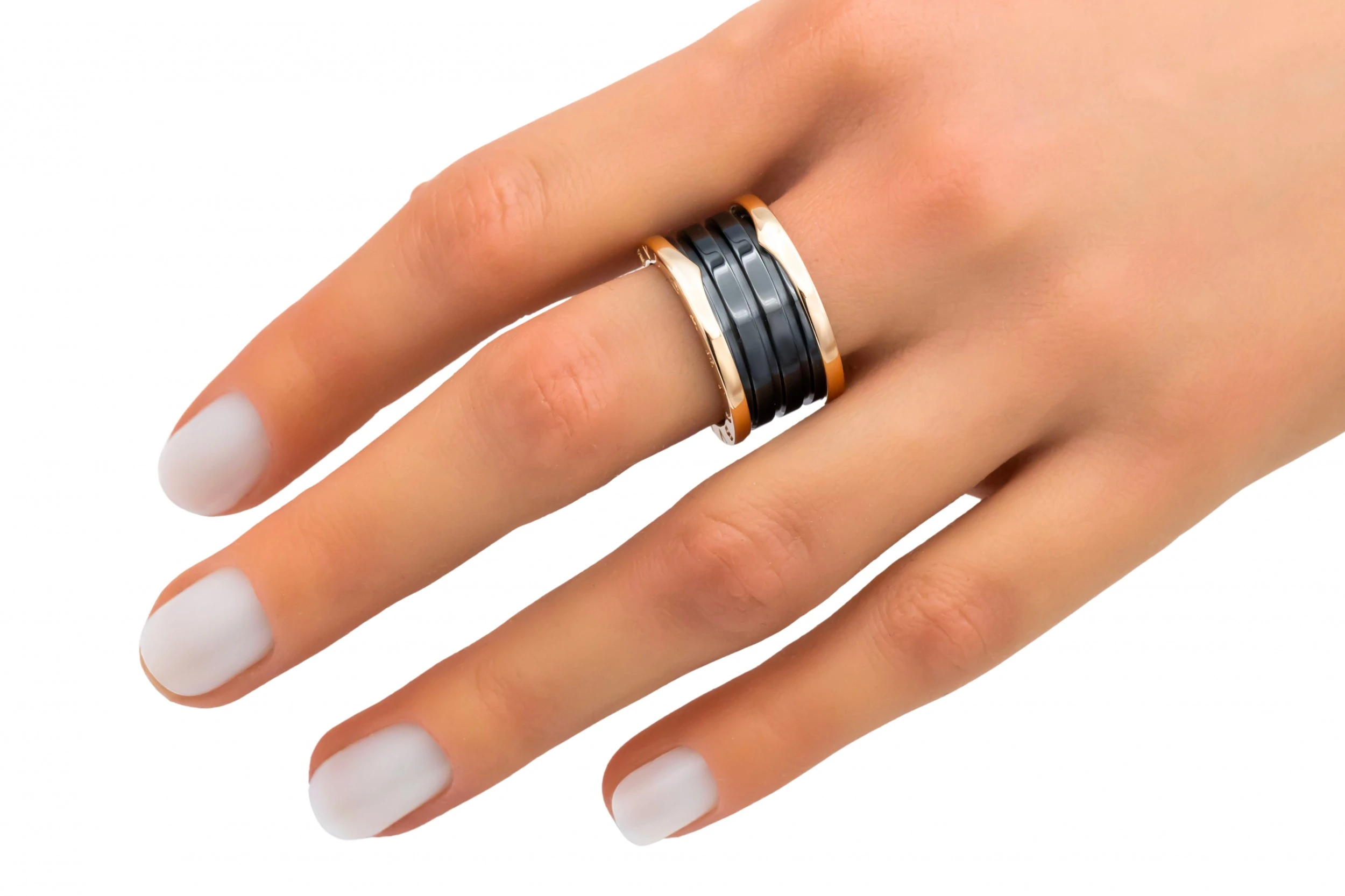 The four-band construction enhances the ring’s volume and visual impact, while the black ceramic introduces a sleek, modern contrast to the warmth of rose gold.