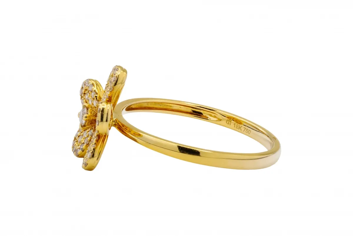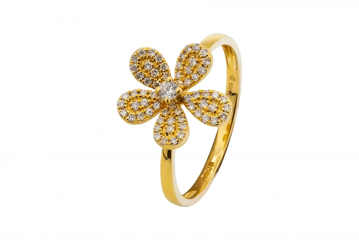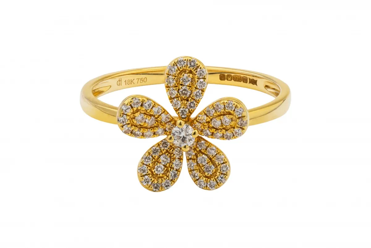 This 18ct Yellow Gold Diamond Flower Ring is a true symbol of natural beauty and elegance. Crafted with meticulous attention to detail, this ring is a stunning piece of fine jewelry that will capture your heart.