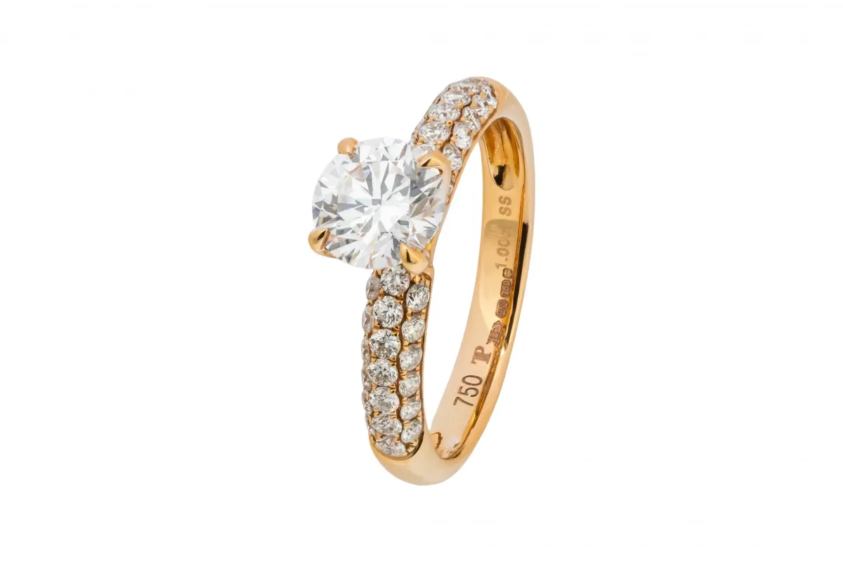 This stunning 18ct rose gold pave-style diamond engagement ring features a 1.00ct round brilliant center diamond, complemented by 38 round brilliant diamonds totaling 0.27ct on the shoulders.