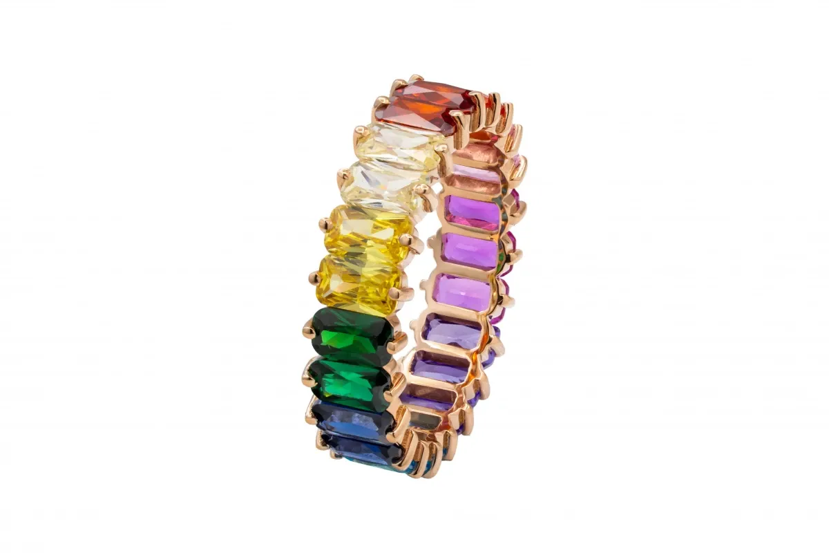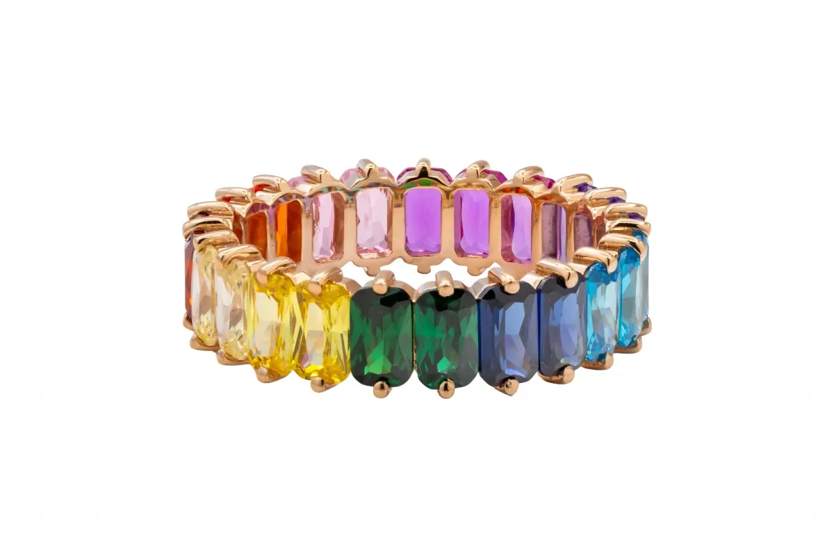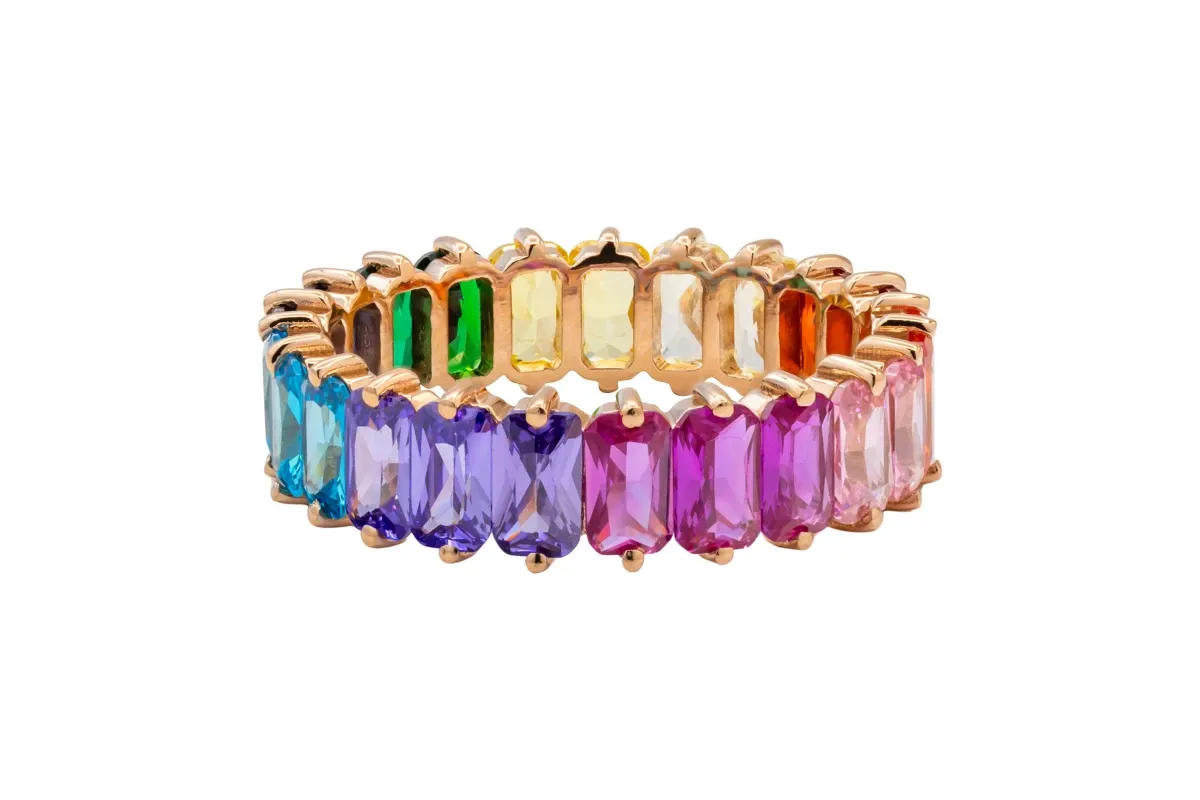 This vibrant full eternity band features a seamless row of emerald-cut rainbow sapphires set in warm 18ct rose gold.