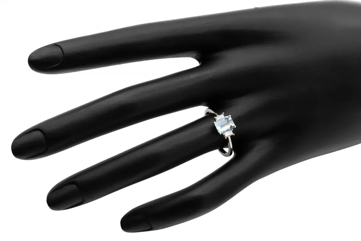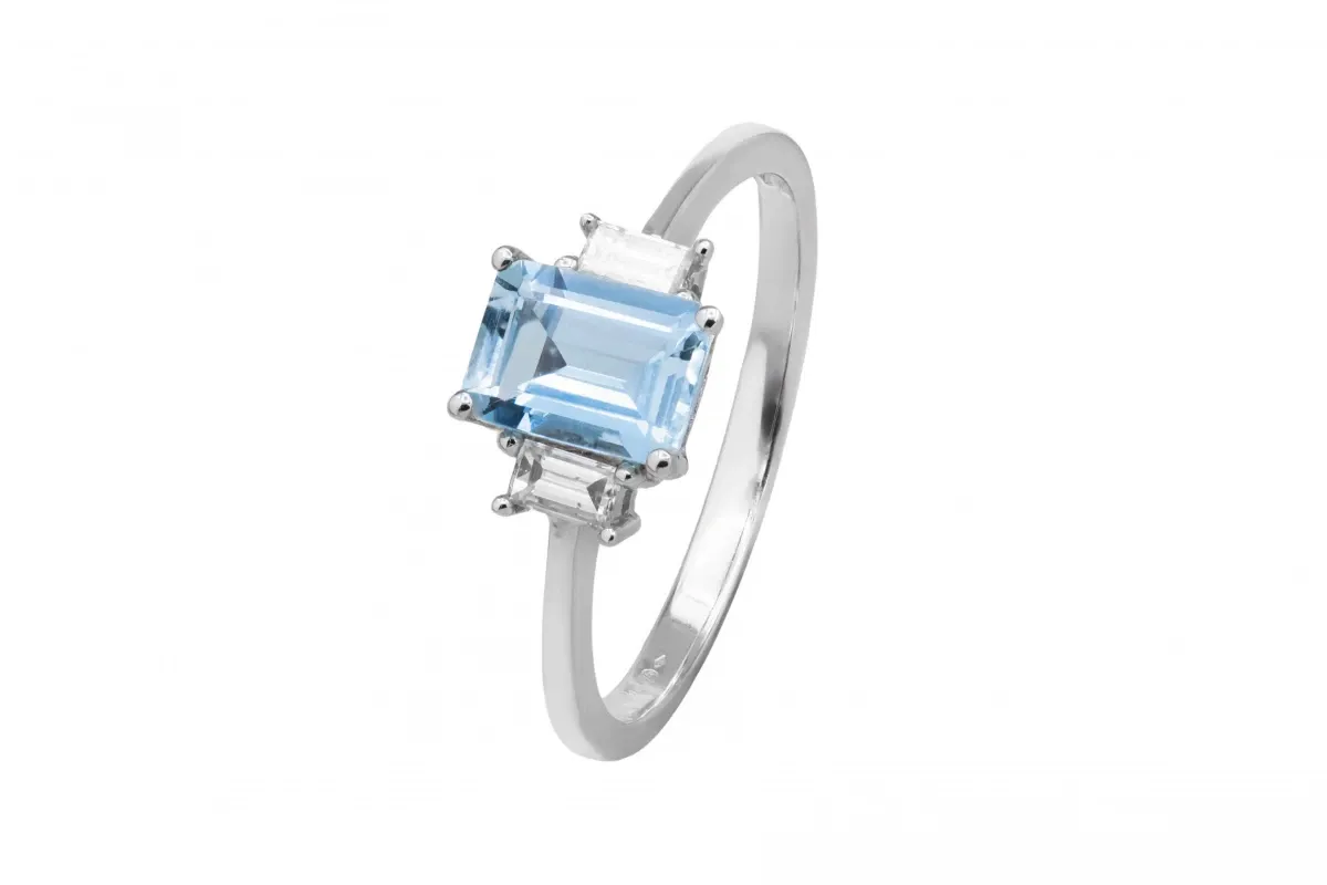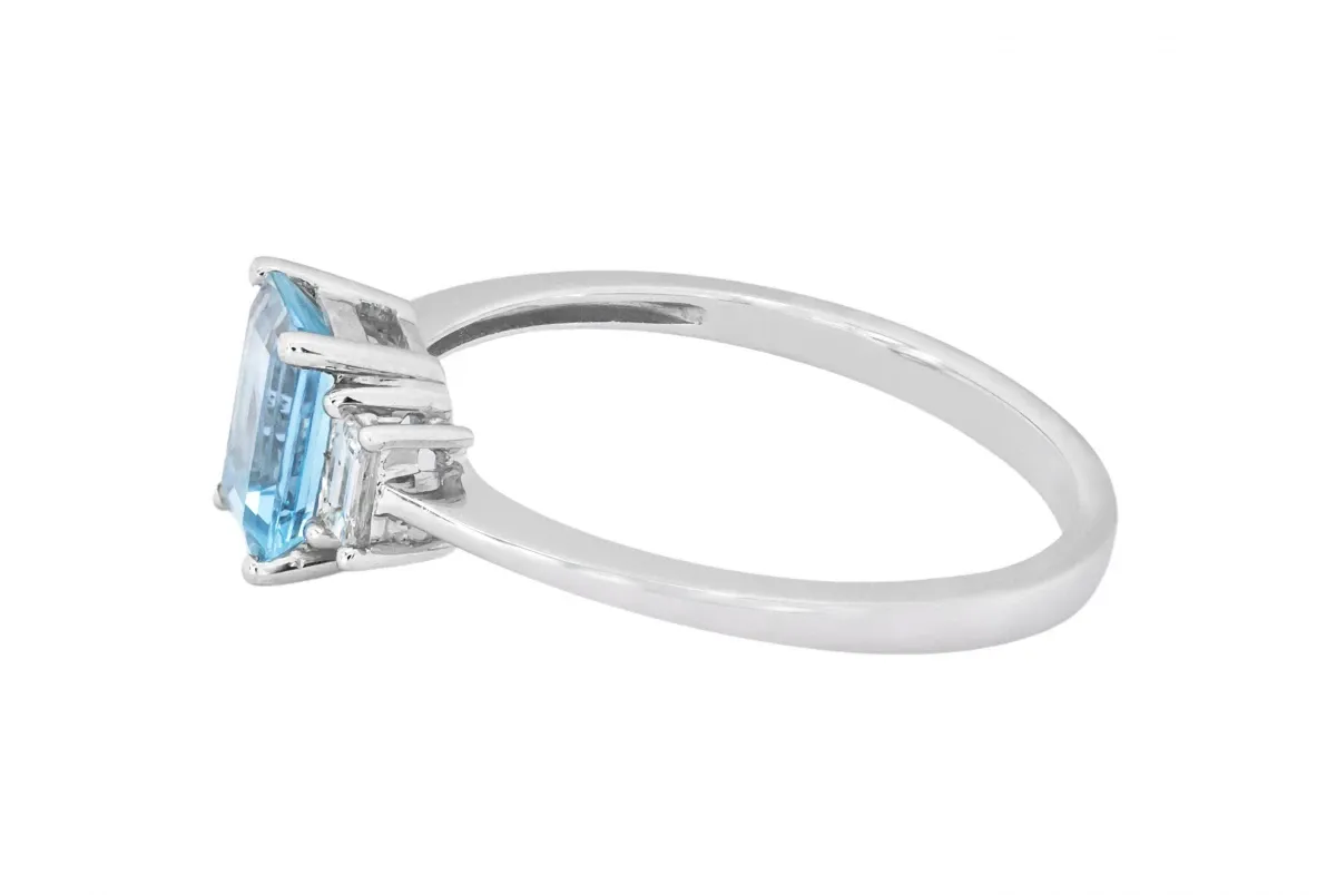 It features a stunning blue aquamarine centre gemstone weighing 0.85ct, claw set in an 18ct white gold band and surrounded by two  diamonds at total 0.20ct weight.