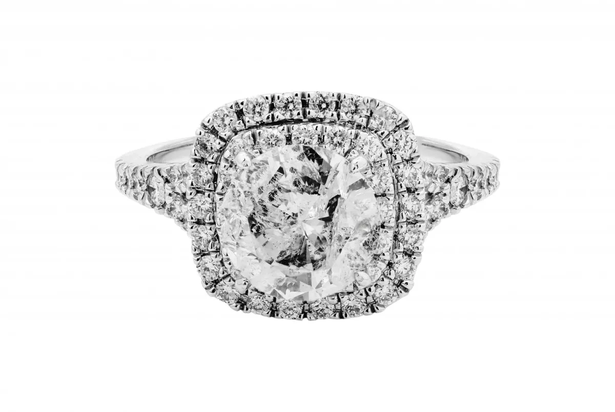A breathtaking statement of brilliance, this elegant 18ct white gold halo engagement ring showcases a magnificent 1.96 carat round brilliant cut centre diamond, expertly positioned to command attention from every angle.