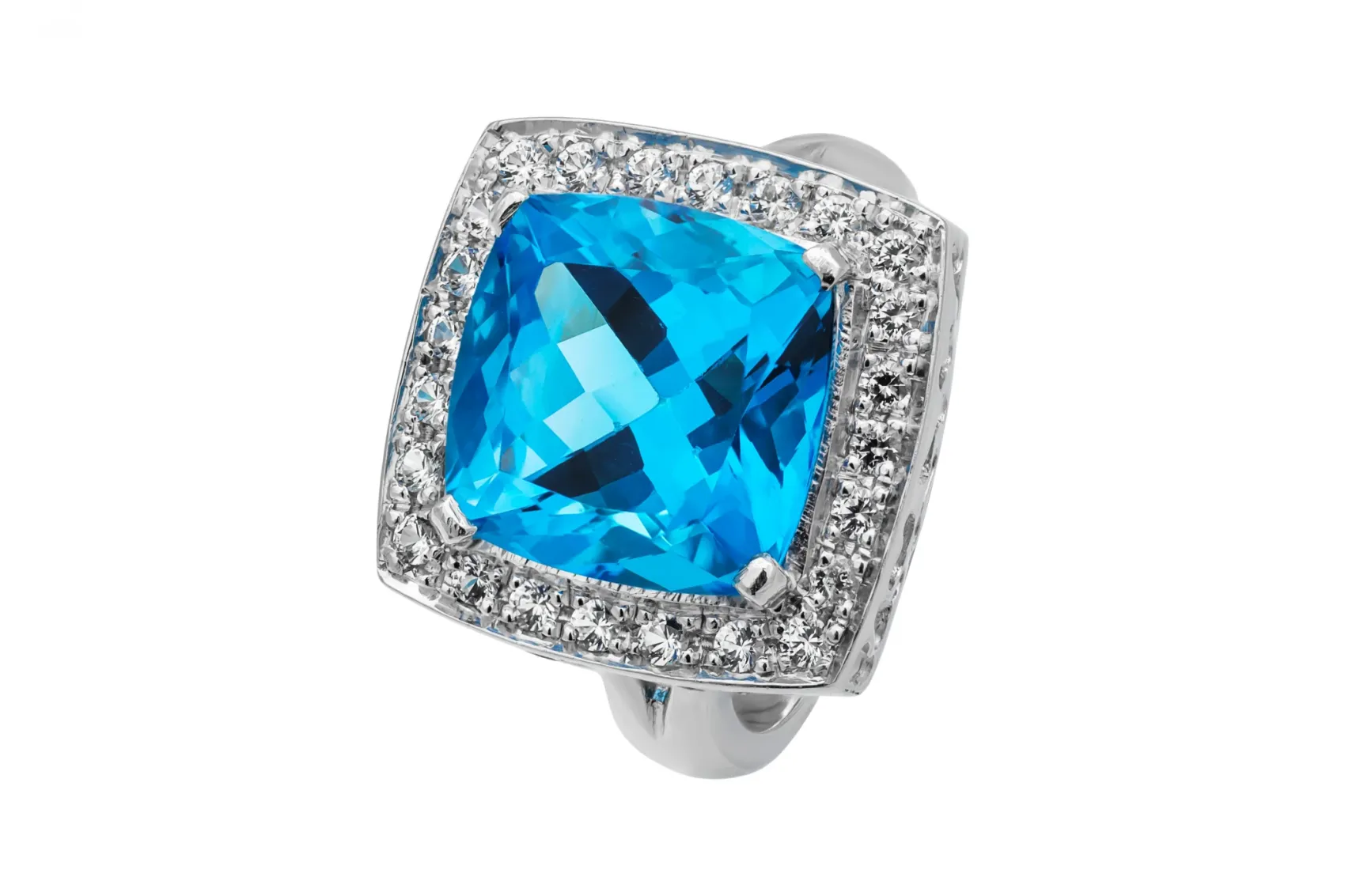 This striking 18ct white gold ring features a vibrant 6.20ct cushion cut aquamarine accented by 0.24ct of diamonds, graded G colour with VS clarity for crisp brilliance.