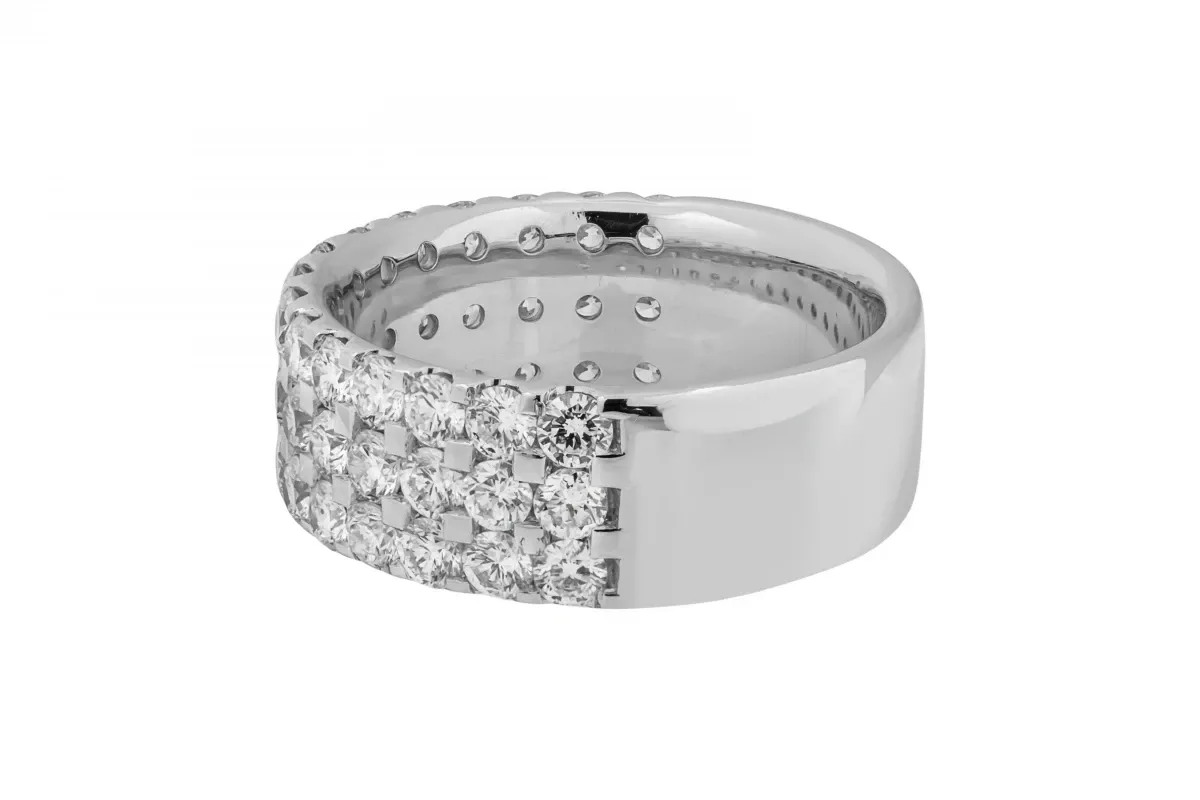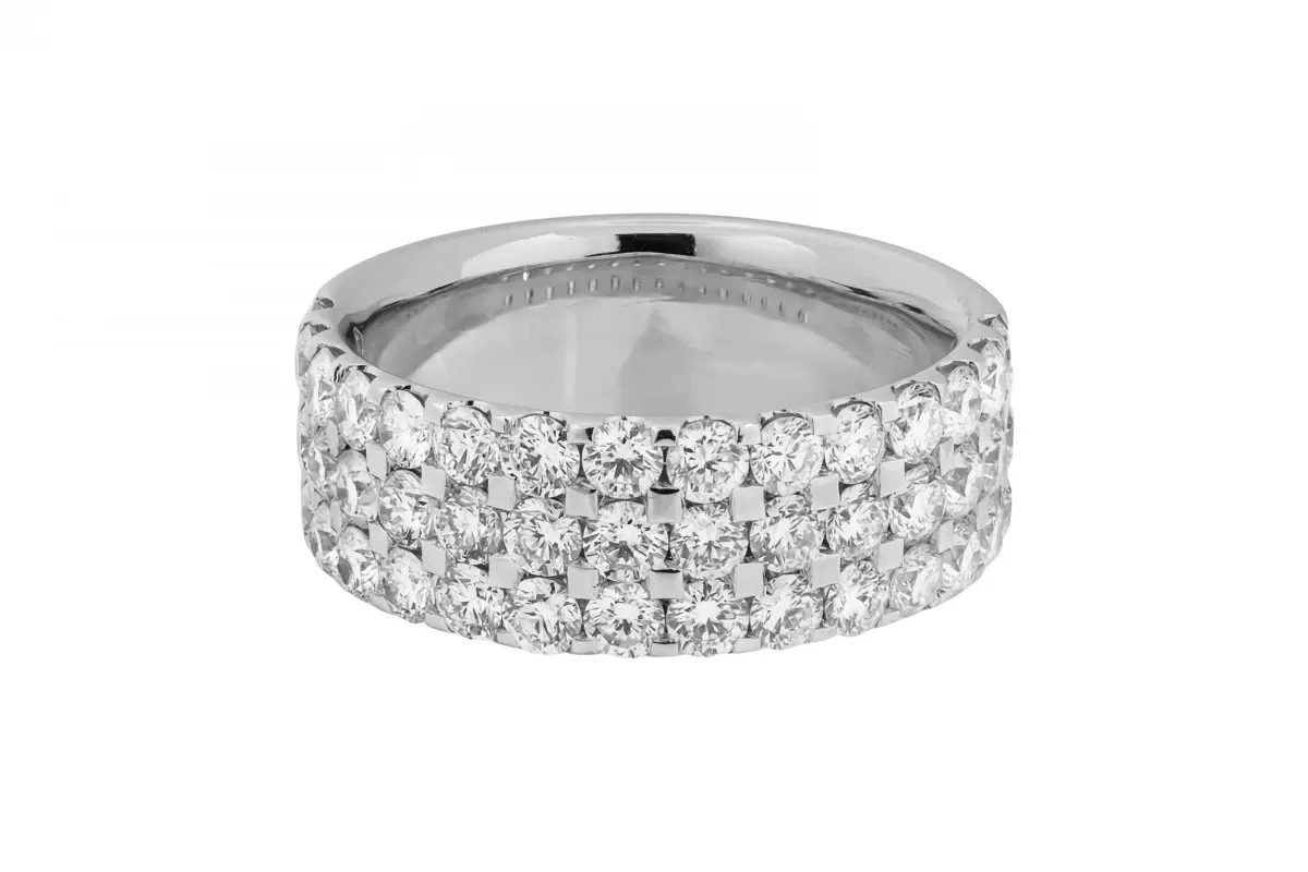 Stunning and bold, this 18ct white gold half eternity ring features three rows of sparkling round brilliant diamonds, totalling 2.30ct.