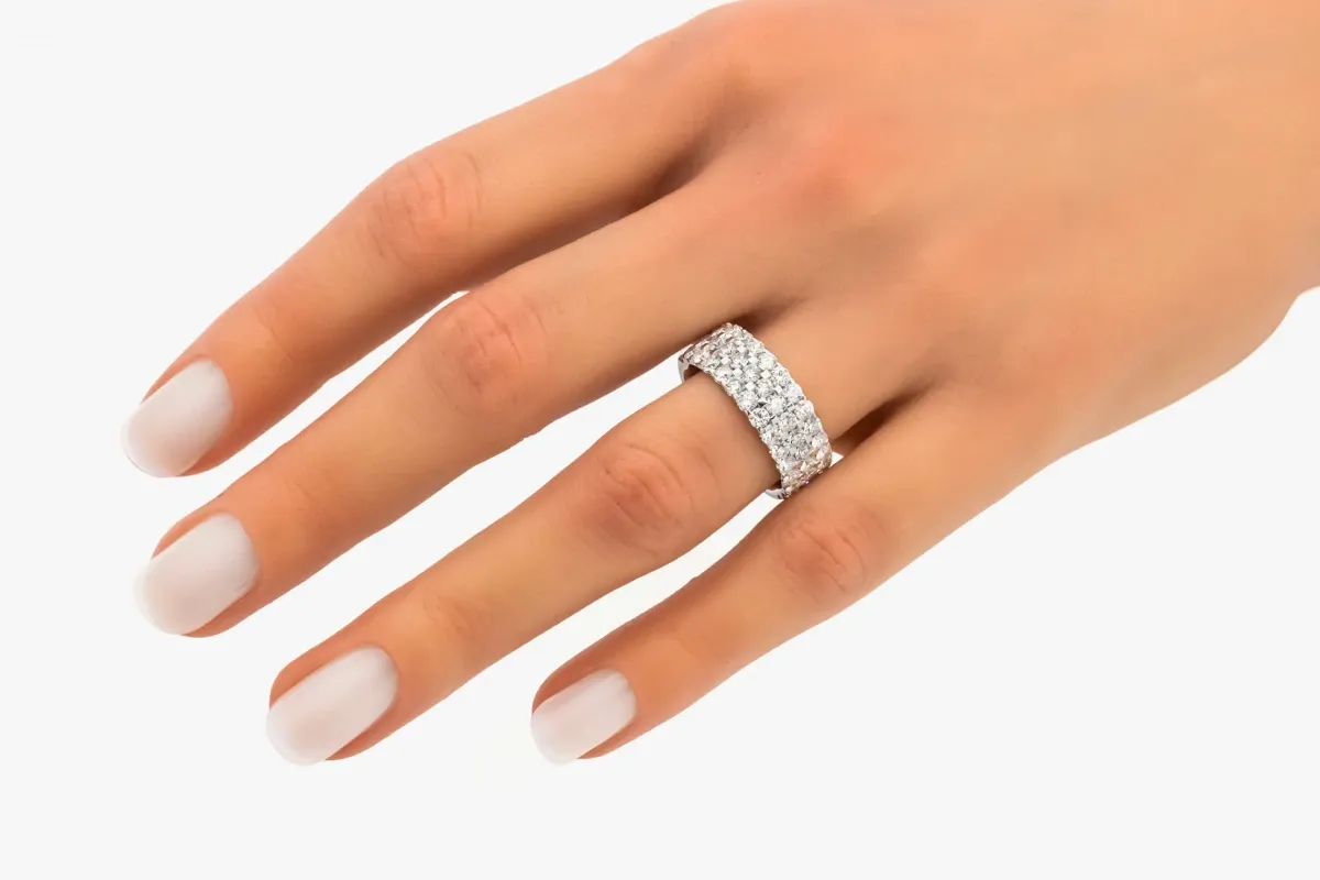The diamonds are graded G colour and VS clarity, offering exceptional brilliance and quality. Measuring 6.96mm wide and crafted to a finger size L, this luxurious piece makes a perfect wedding band, anniversary ring, or statement accessory.