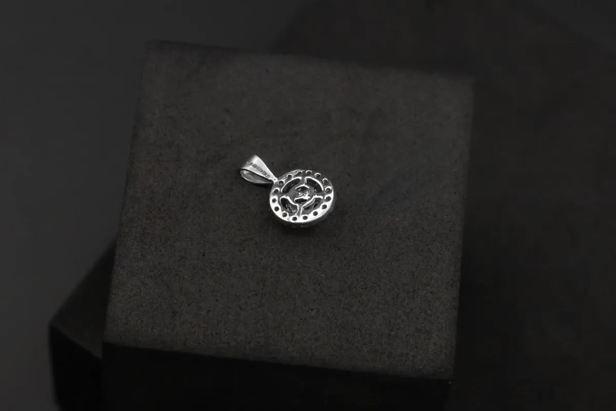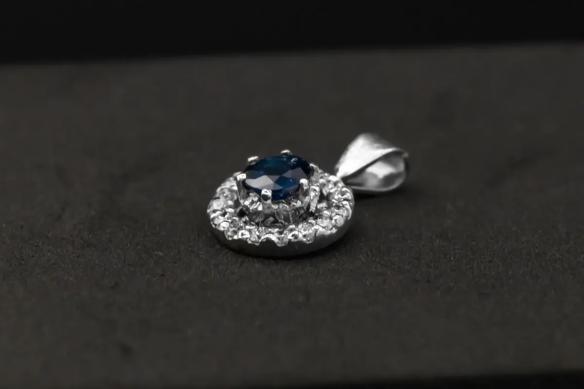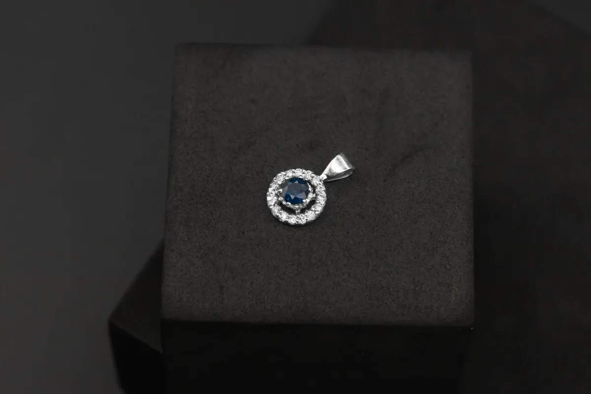 Measuring 10mm, this pendant combines the deep allure of sapphire with the brilliance of diamonds, making it a timeless and sophisticated piece for any jewellery collection.1.4gms