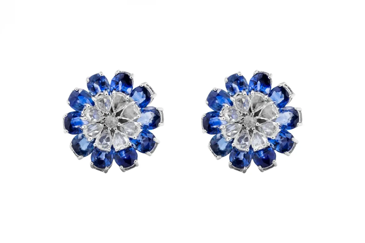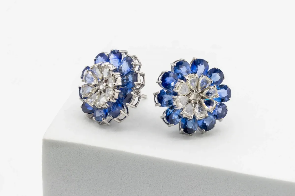 Stunning 18ct White Gold Diamond & Sapphire Rose Cut Earrings