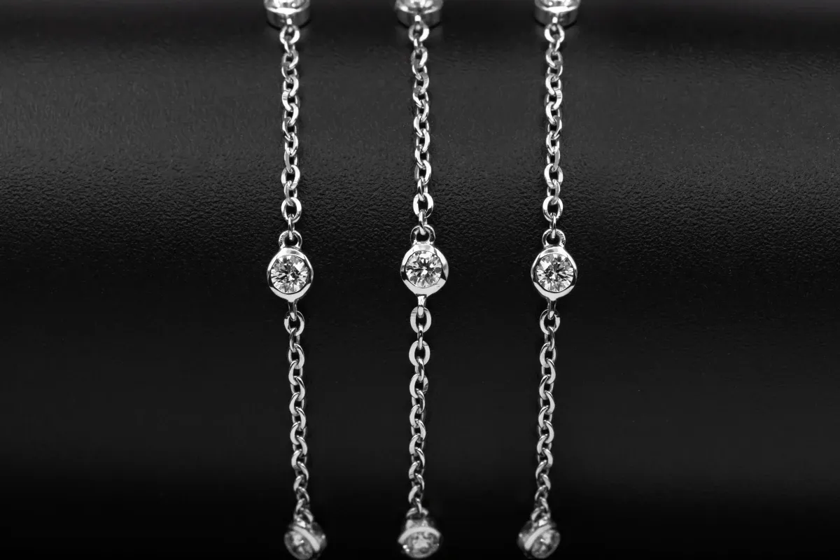 The necklace features ten resplendent diamonds, each securely nestled in a rub-over setting, totaling an impressive 1.04cts. The rub-over design enhances the diamonds' natural beauty, creating a seamless and sophisticated look.
