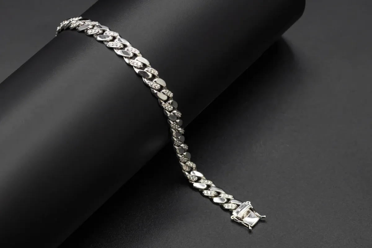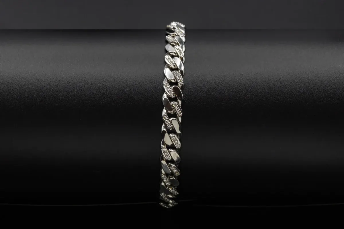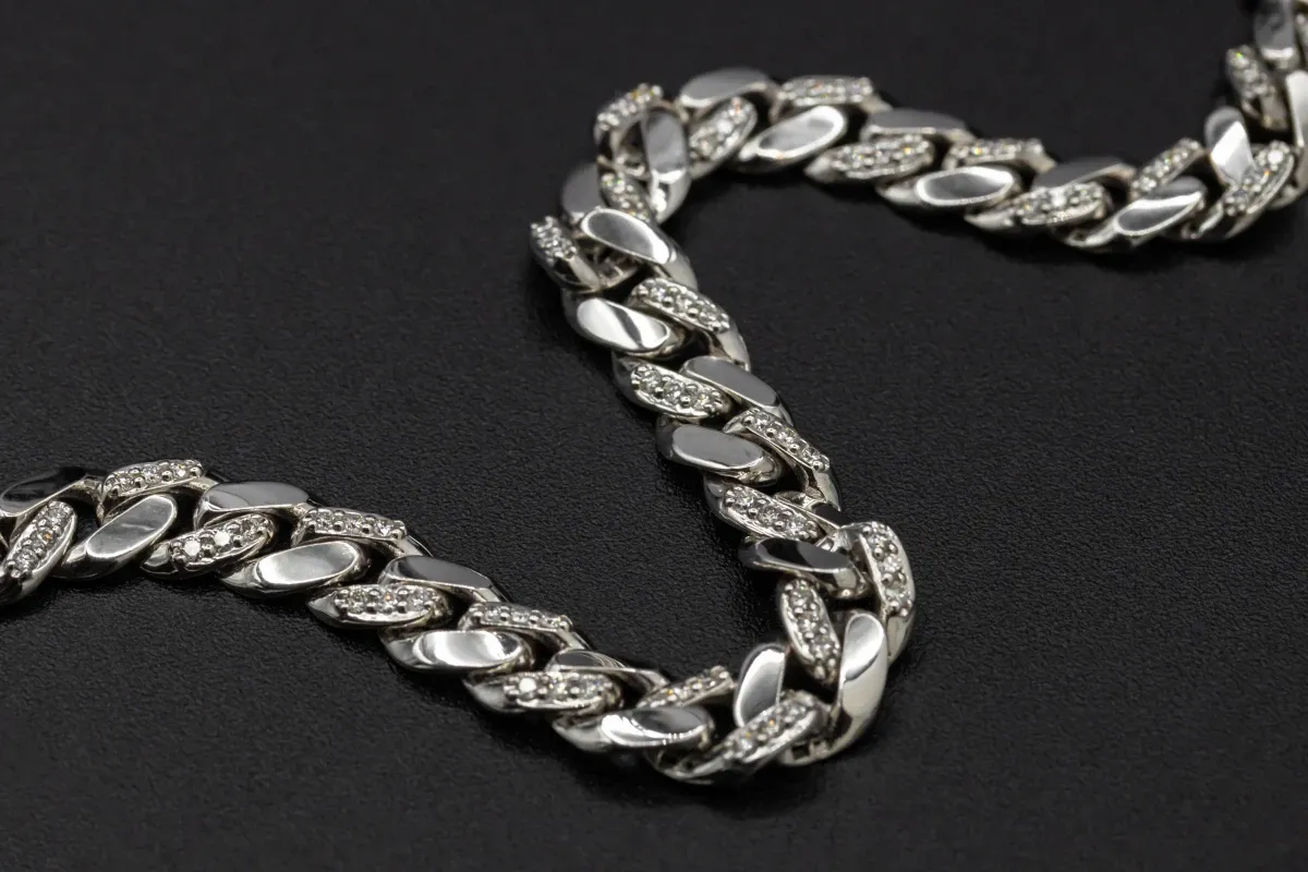 This super stylish bracelet is in the classic curb link in 18ct white gold. It is set with brilliant round diamonds totalling 1.05ct vs.