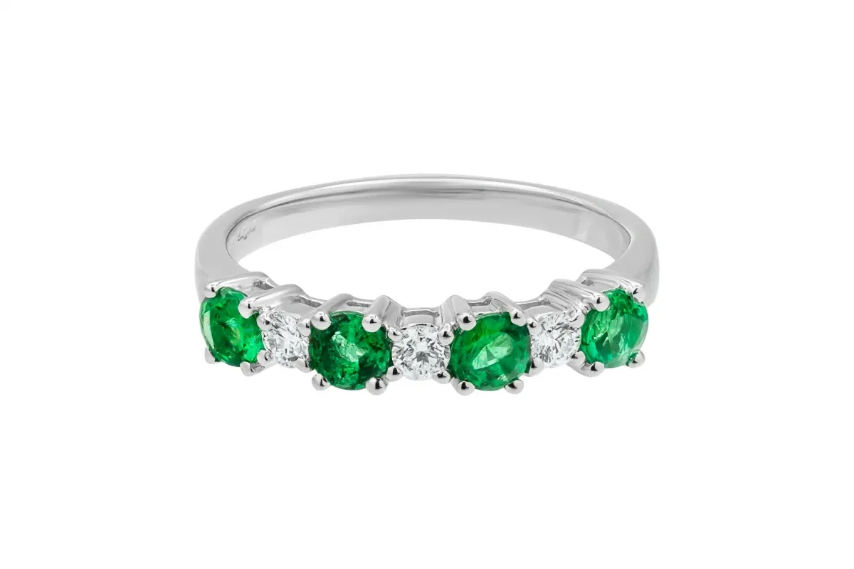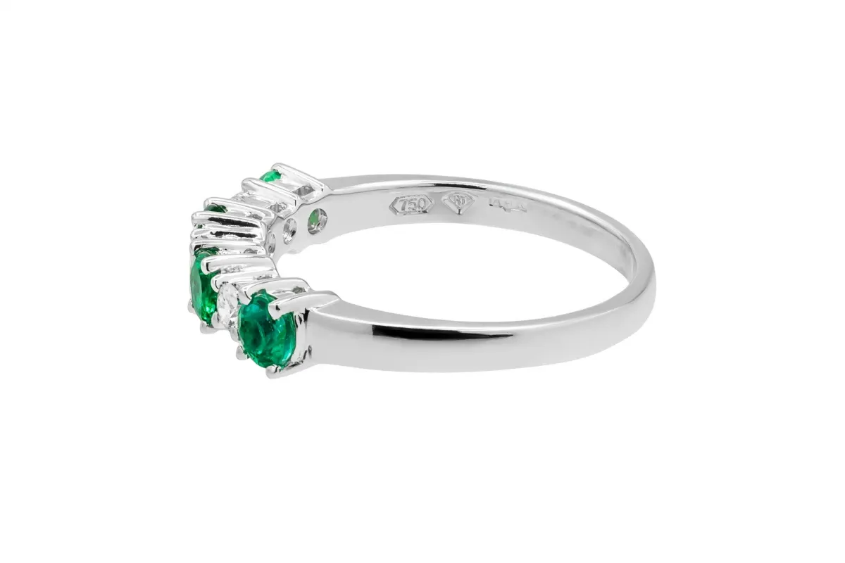This elegant 18ct white gold eternity band is set with alternating round brilliant H VS diamonds (0.15ct) and vivid green emeralds (0.53ct).