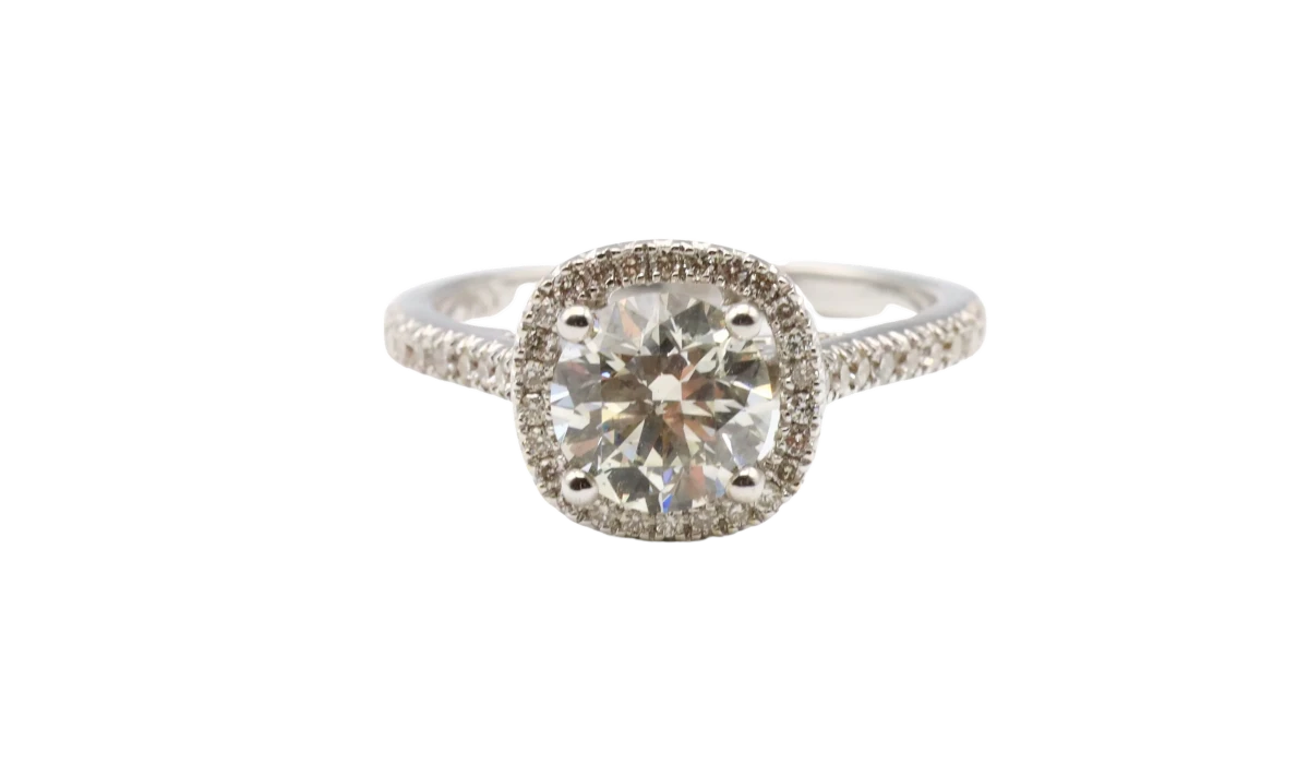 18ct White gold diamond engagement ring, set with diamond around the halo and on the shoulders. The centre solitaire is a 0.90ct brilliant cut diamond with a HRD certificate stating the diamond quality is a H colour Si1 clarity diamond.
