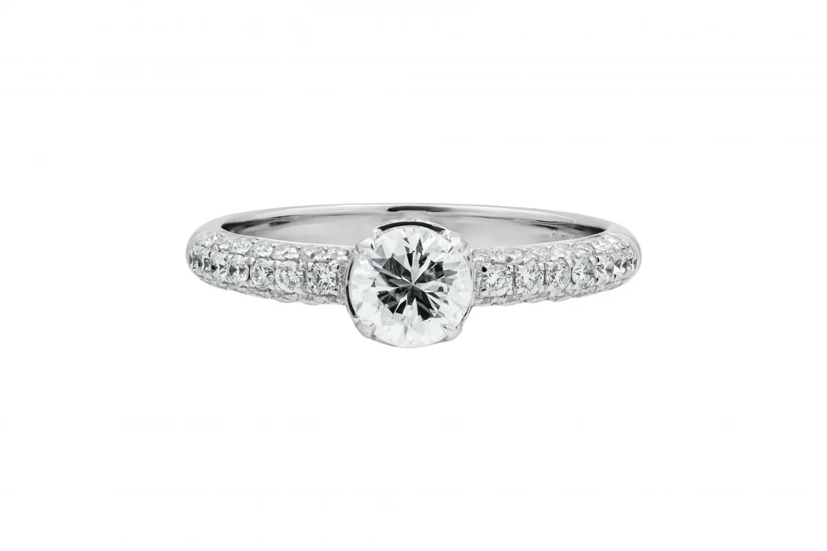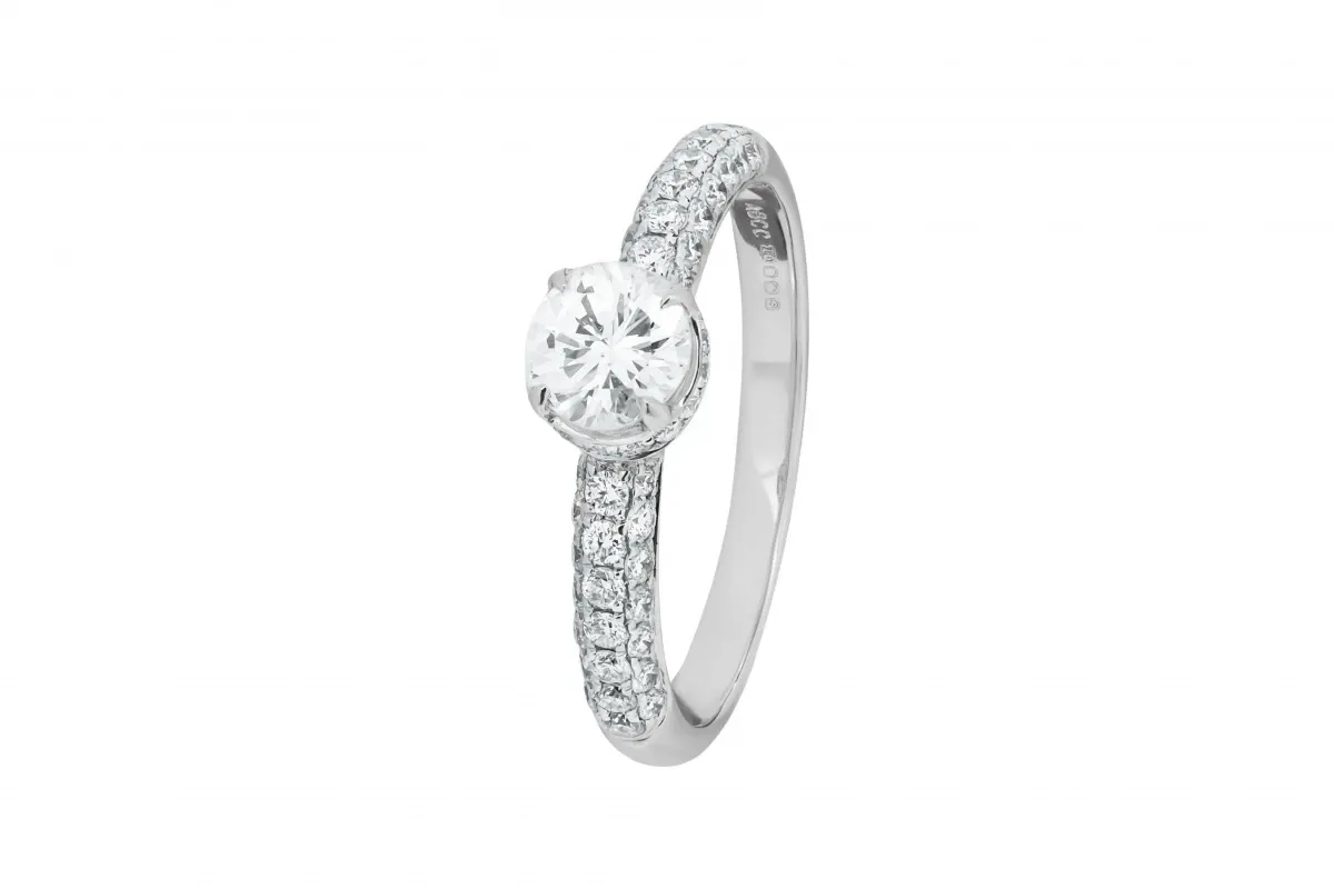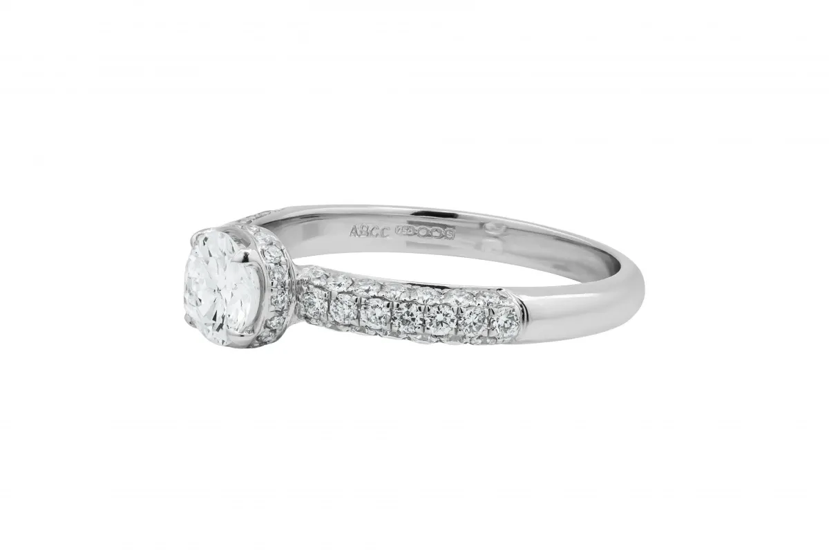 This exquisite 18ct white gold engagement ring features a timeless four claw setting for a 0.74ct round brilliant cut centre diamond, graded H/I in colour and SI1 in clarity.