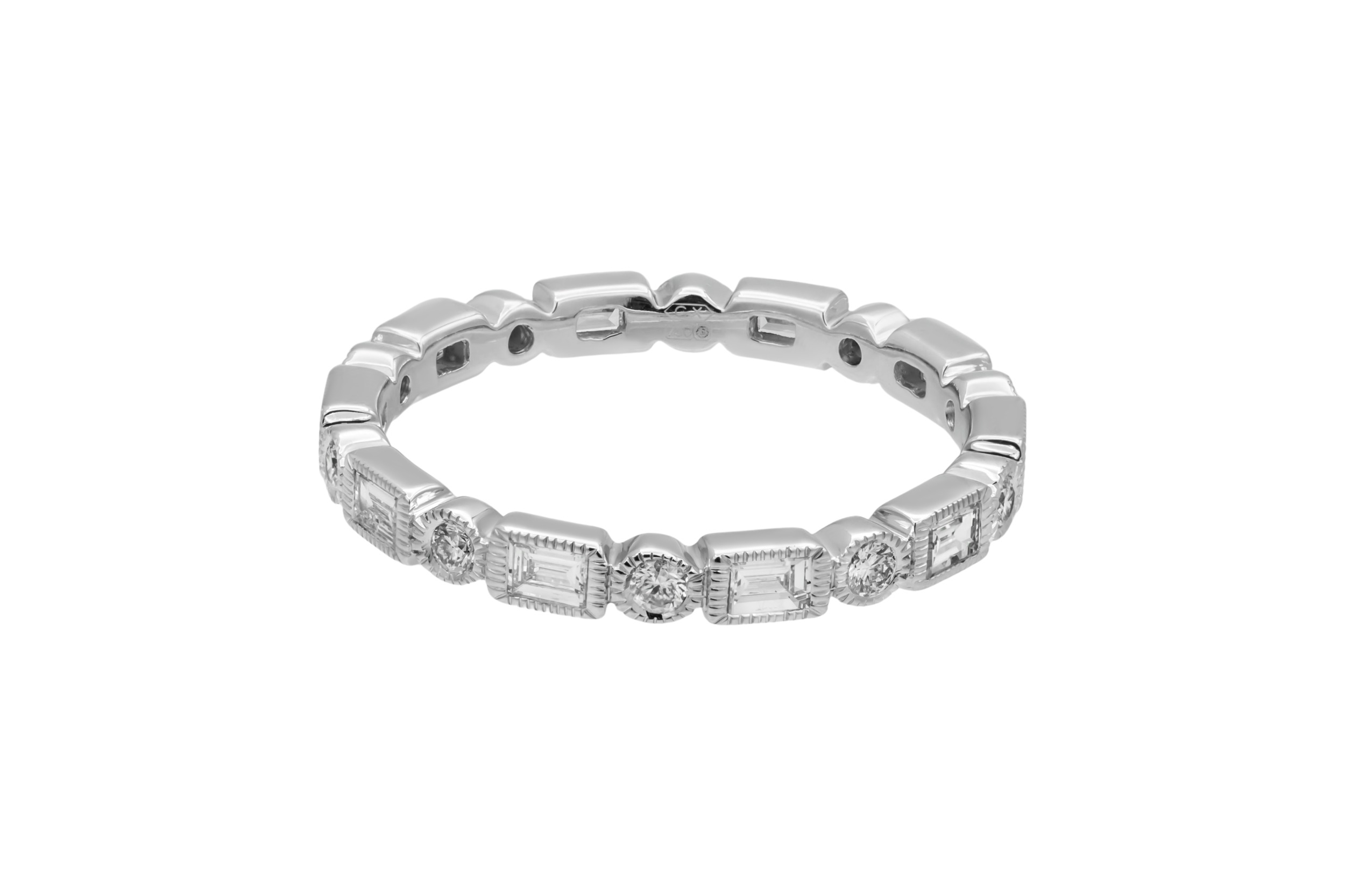 This refined 18ct white gold full eternity ring features a continuous arrangement of baguette and round brilliant cut diamonds totalling 0.50ct, graded G colour with SI clarity for crisp sparkle and elegant contrast.
