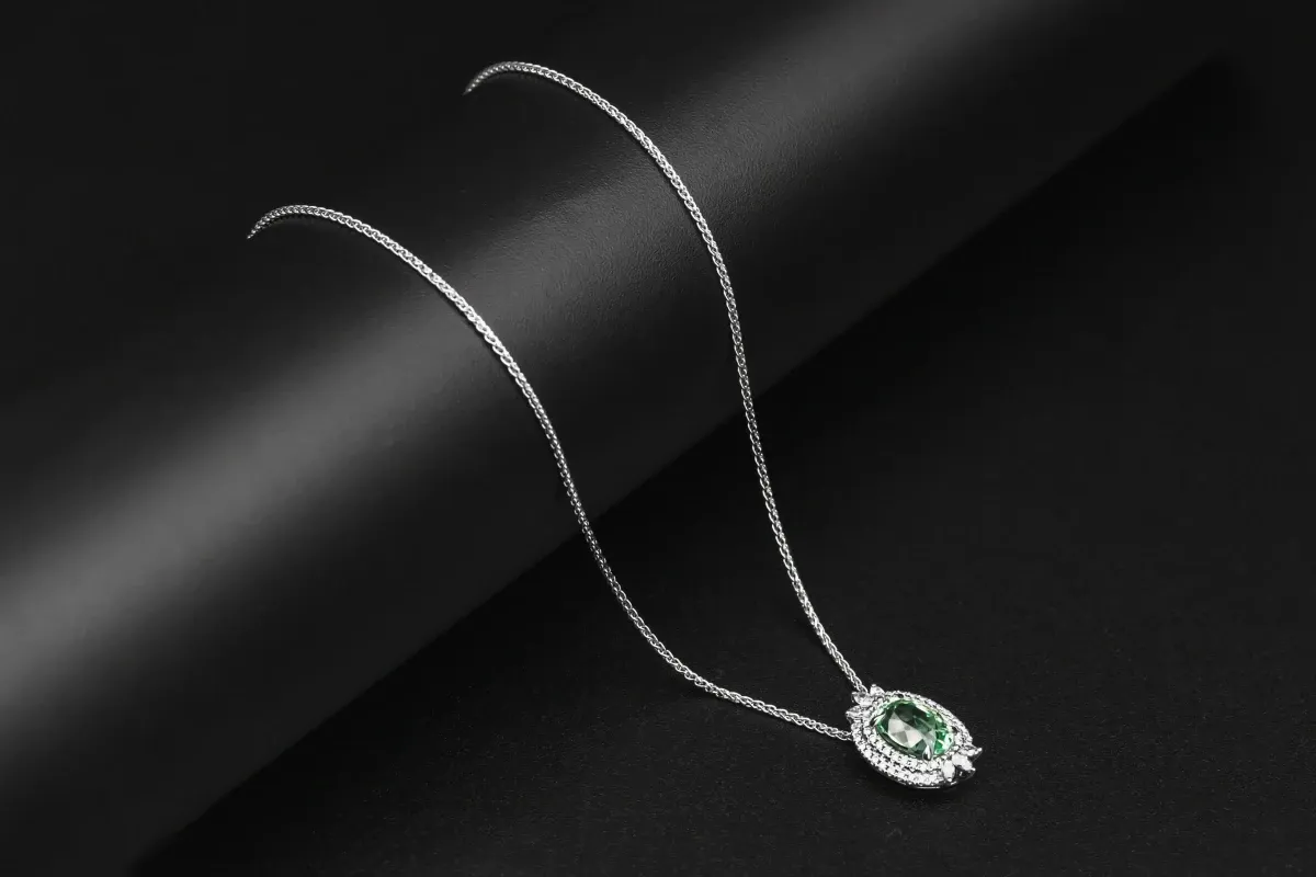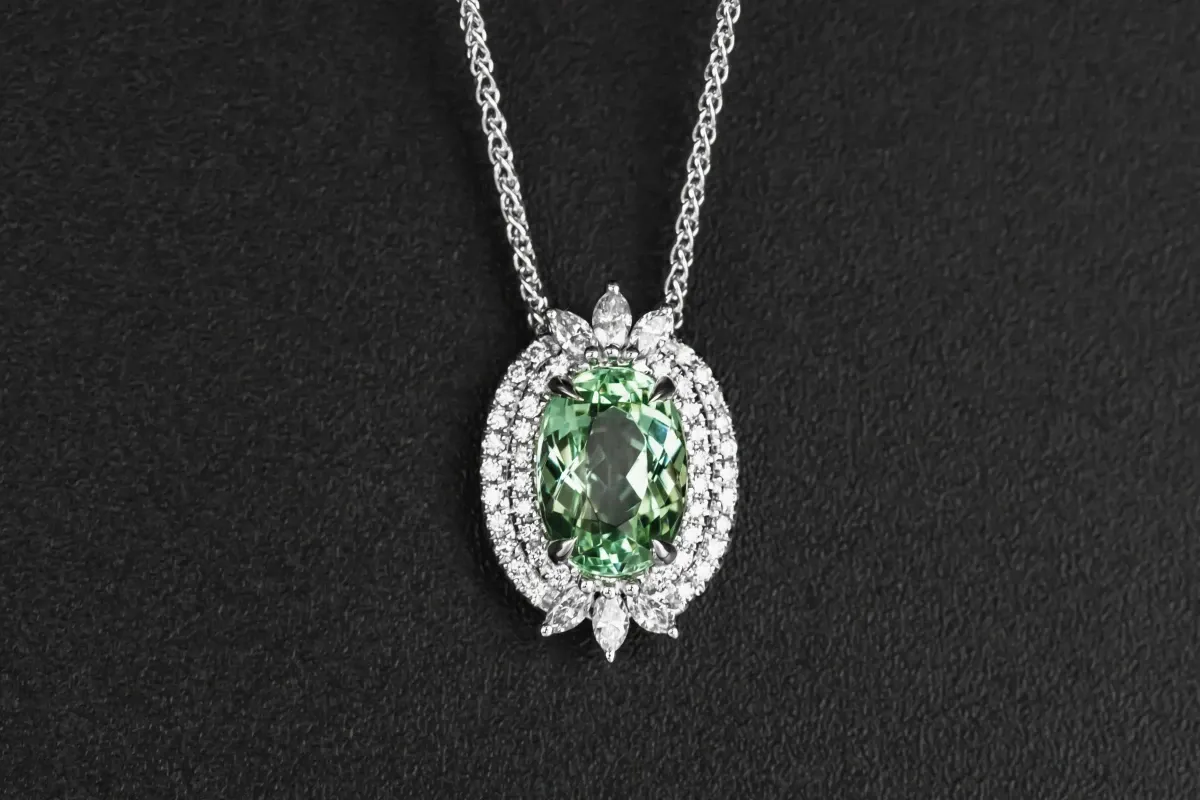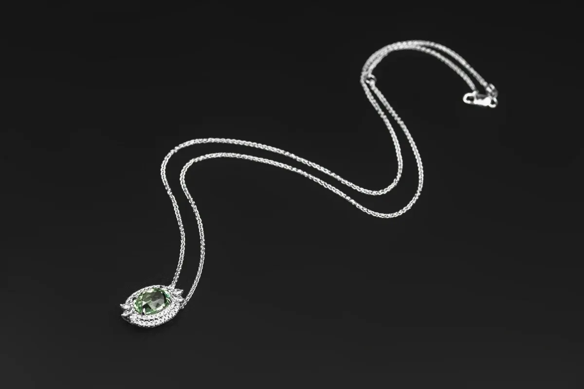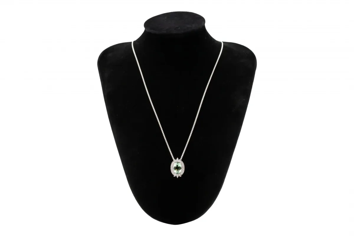 This elegant necklace is crafted in 18ct white gold and showcases a striking combination of natural gemstones. At its heart are vivid green topaz stones, beautifully accented by sparkling marquise cut diamonds. The total diamond weight is 0.41ct.