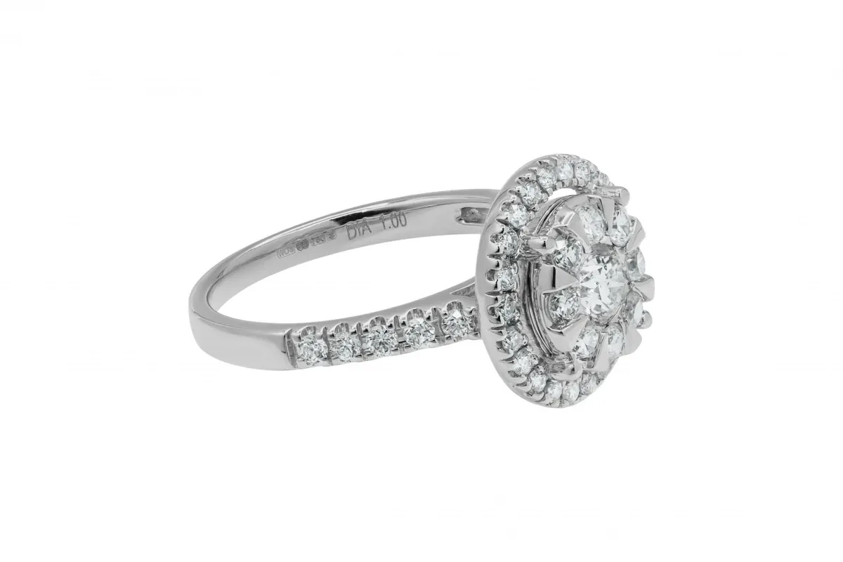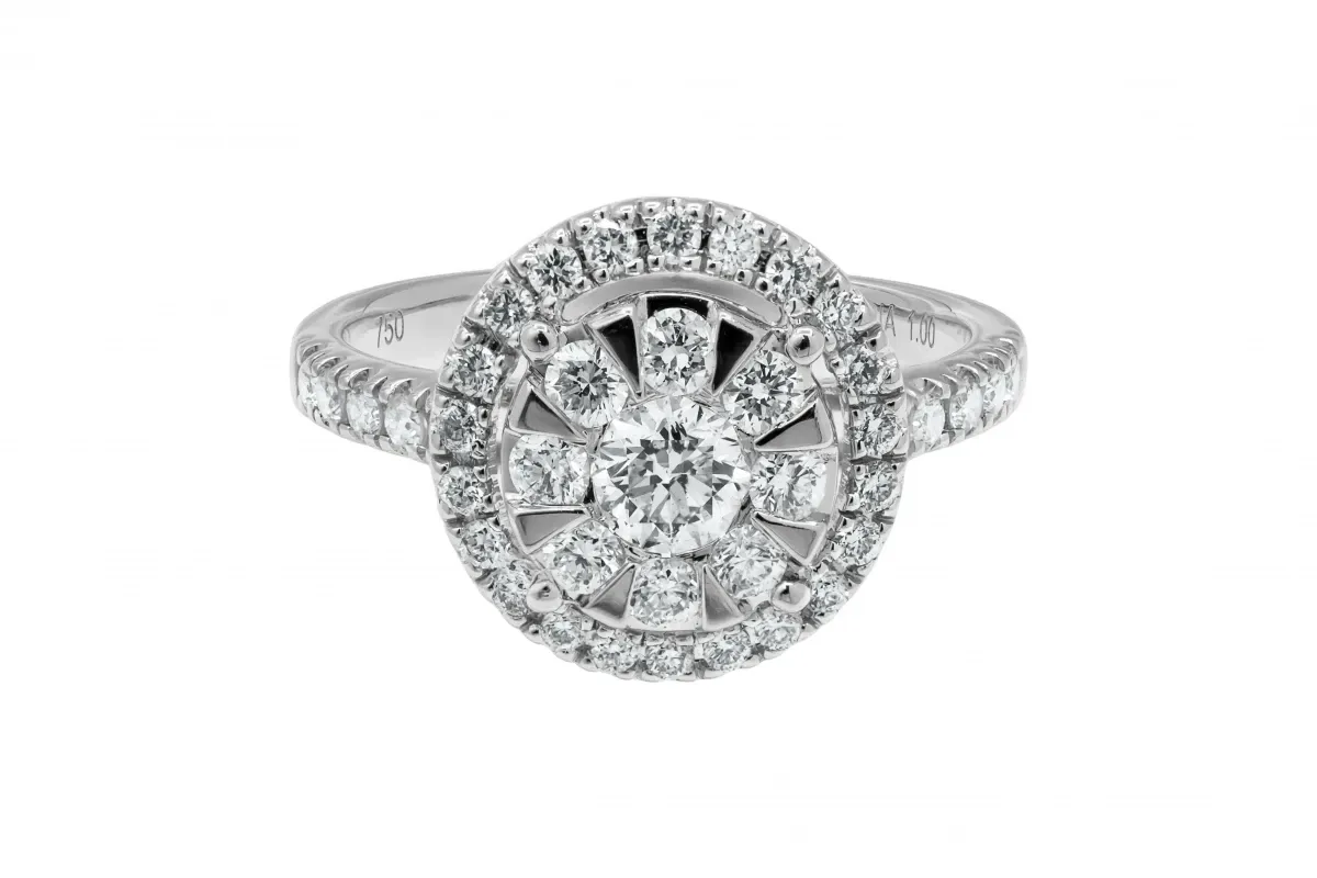 This 18ct white gold diamond halo ring is a striking display of brilliance and craftsmanship.