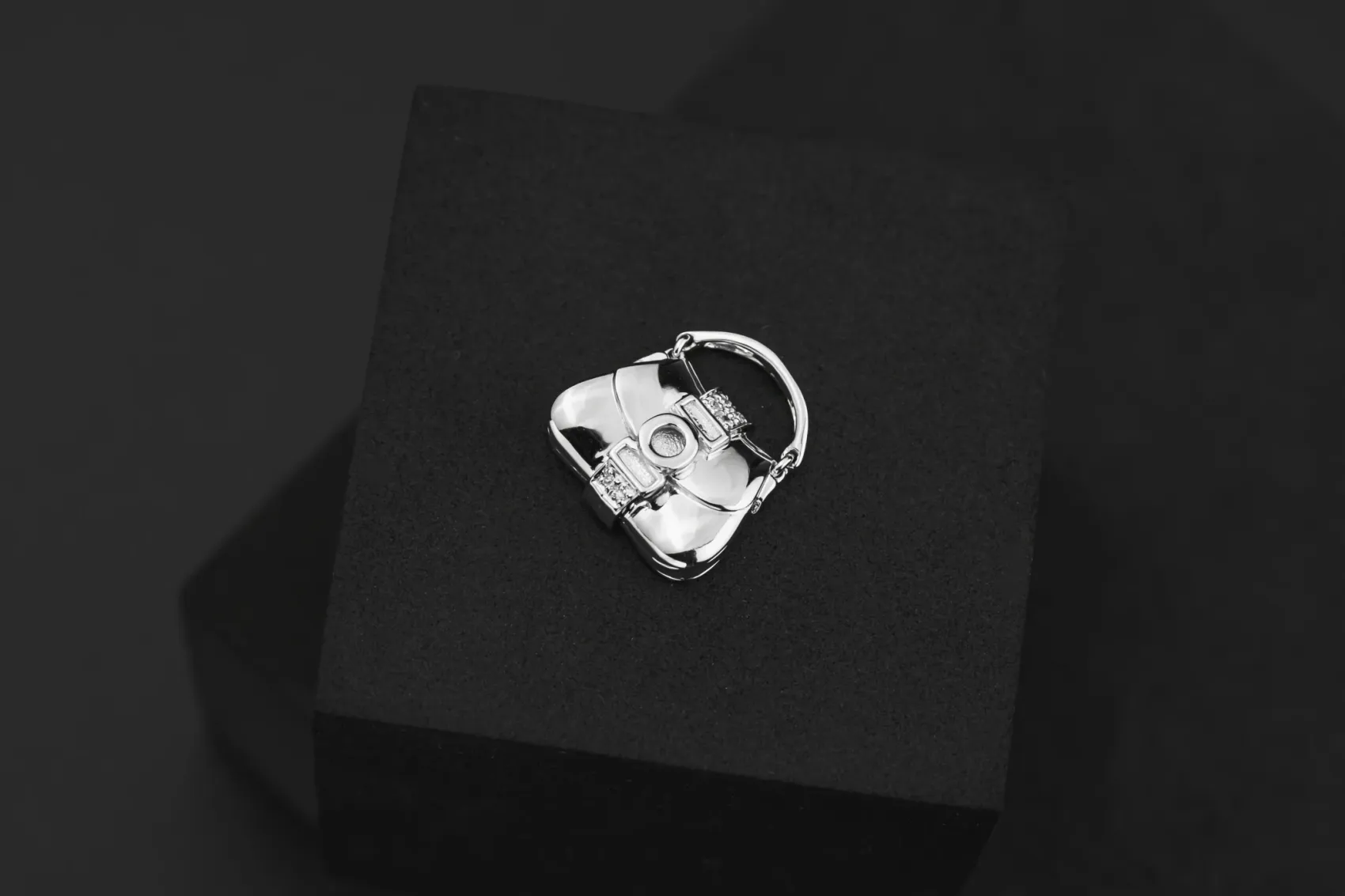 This stylish 18ct white gold diamond handbag pendant weighs 4.1g and is adorned with sparkling brilliant-cut diamonds, creating a playful yet luxurious statement piece. Perfect for adding a touch of elegance to any outfit, it can be worn as a distinctive pendant or layered with other necklaces for a contemporary look.