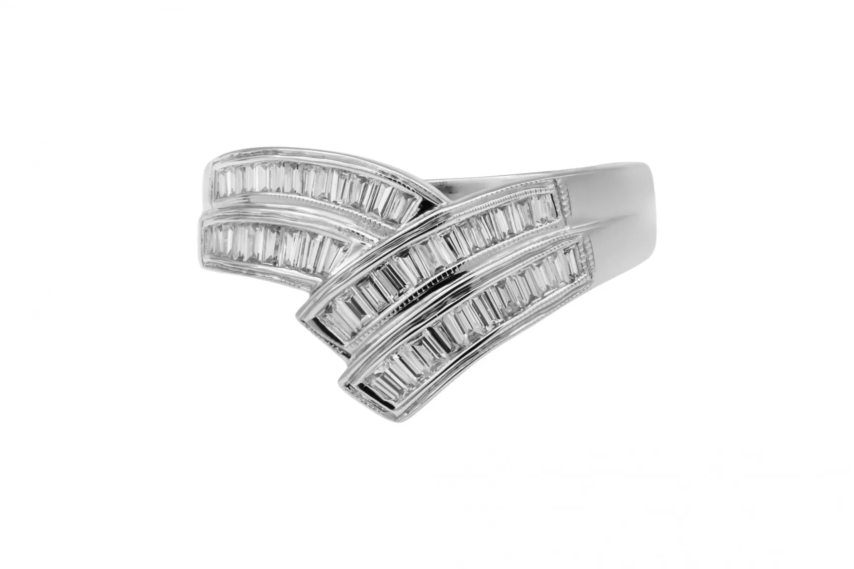 This refined 18ct white gold ring features a sleek double row design set with 0.50ct of baguette cut diamonds. Graded G colour with VS clarity, the diamonds are channel set to create clean lines and a contemporary, architectural look with elegant sparkle.