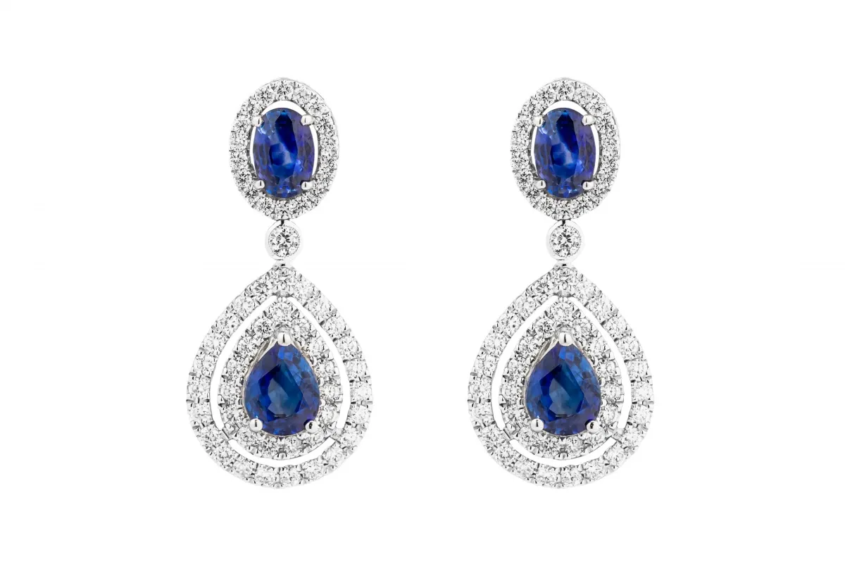 Featuring two oval sapphires totaling 1.27ct, two pear-shaped sapphires totaling 1.85ct, and a dazzling array of 114 diamonds totaling 1.19ct.