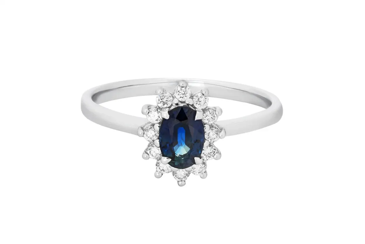 Oval Sapphire & Diamond Halo Ring in 18ct White Gold 0.56ct
