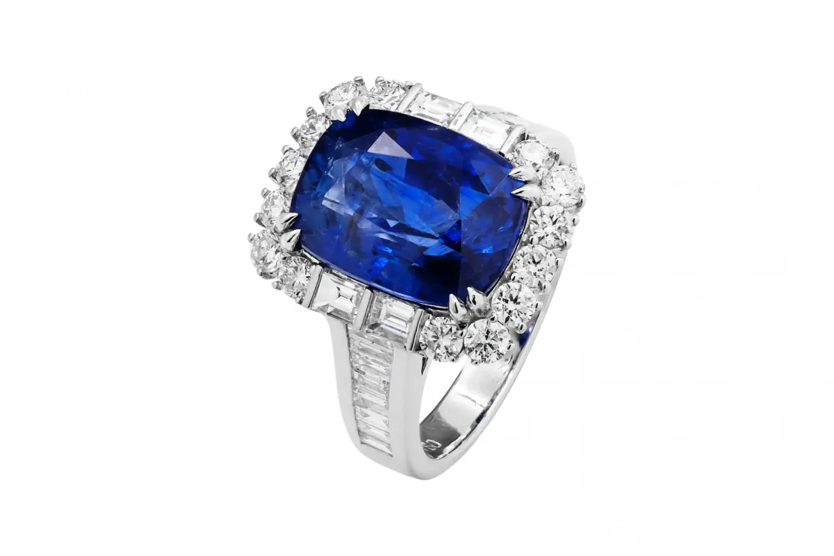 A masterpiece set with 13 brilliant diamonds, 24 emerald diamonds, and a mesmerizing 6.91ct natural sapphire.