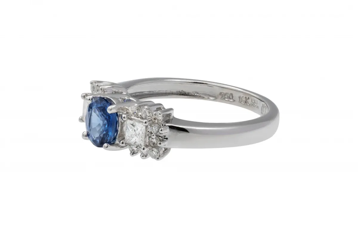 An exquisite blend of timeless elegance and vibrant colour, this 18ct white gold ring features a stunning 0.70ct deep blue sapphire at its heart, flanked by 0.78ct of dazzling F VS1 diamonds.