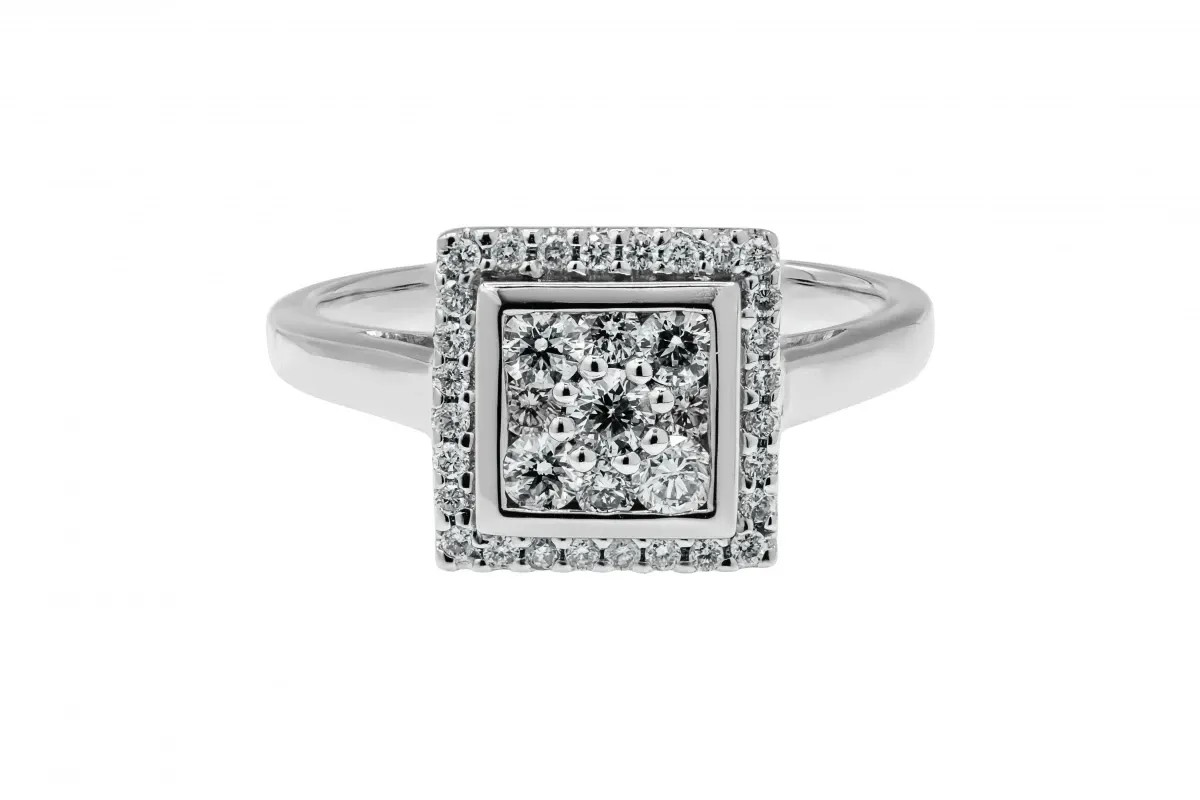 This elegant 18ct white gold diamond square ring is a beautifully crafted piece featuring a total of 0.69 carats of natural diamonds.