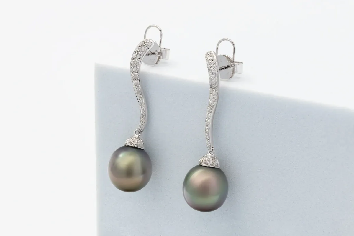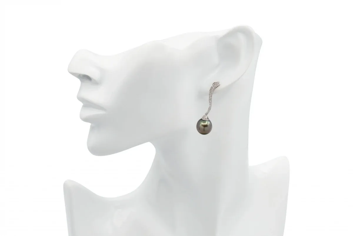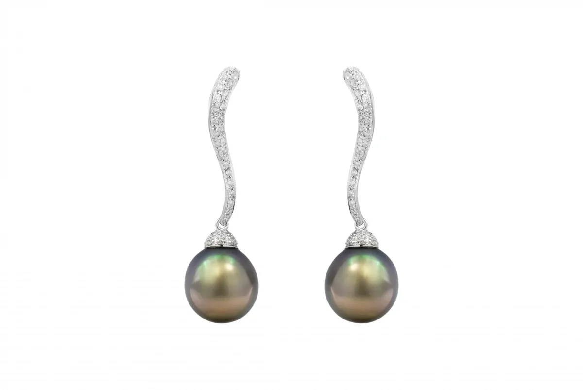 A luxurious statement of elegance, these 18ct white gold drop earrings feature luminous Tahitian pearls gracefully suspended beneath a dazzling cascade of F colour, VS clarity diamonds.
