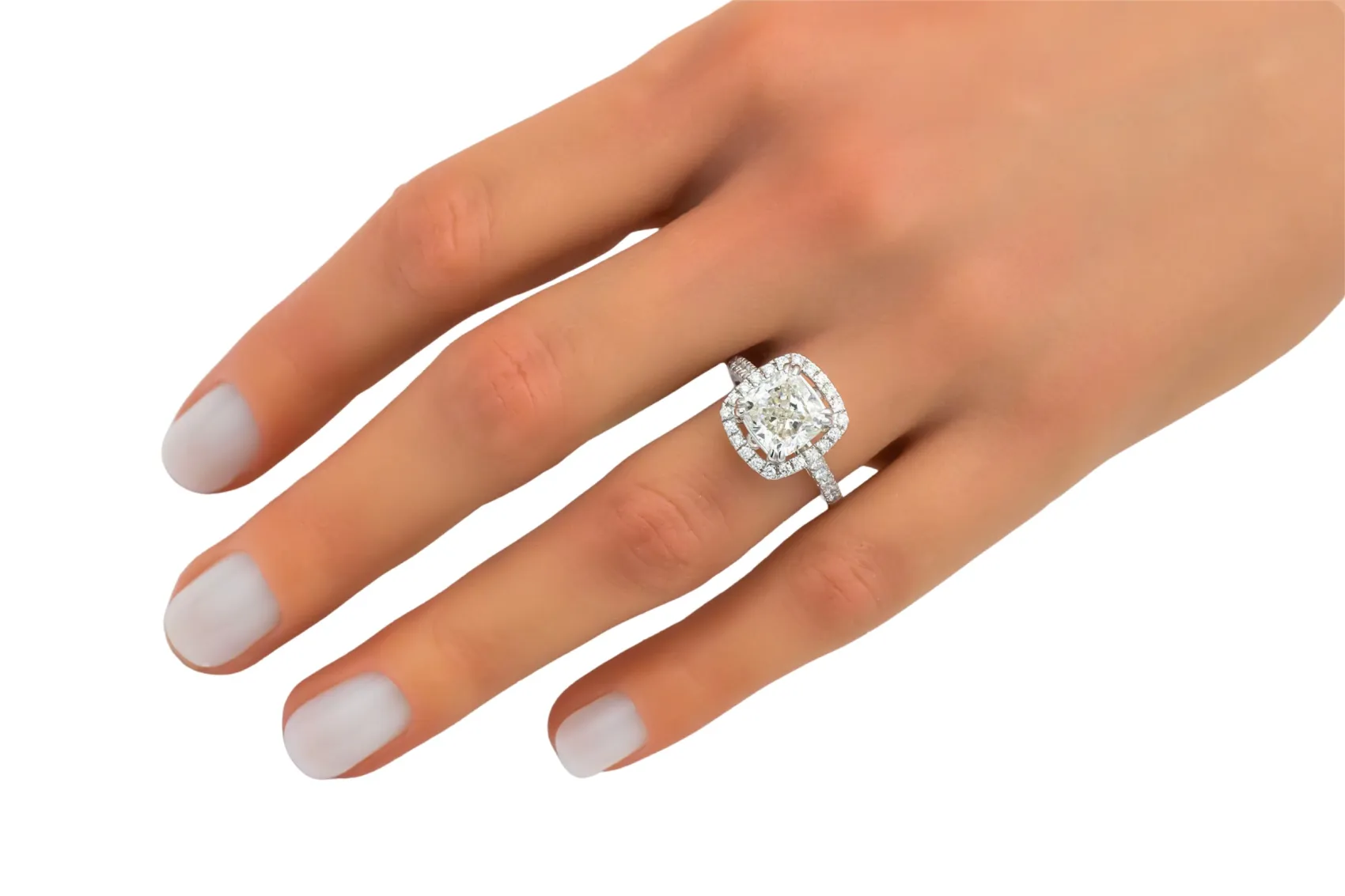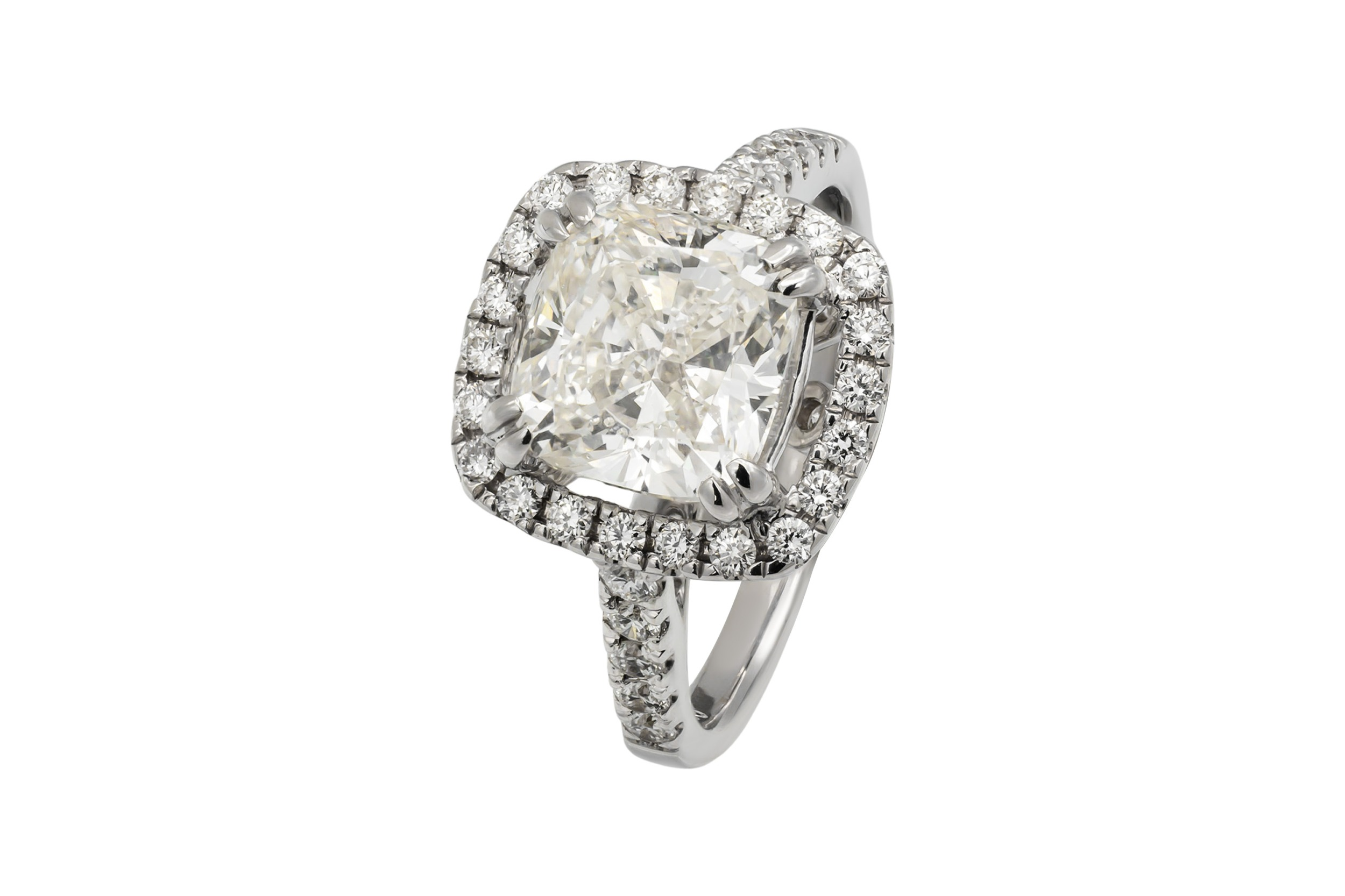 An impressive 3.26 carat diamond takes centre stage in this 18ct white gold engagement ring, offering bold scale and commanding presence.