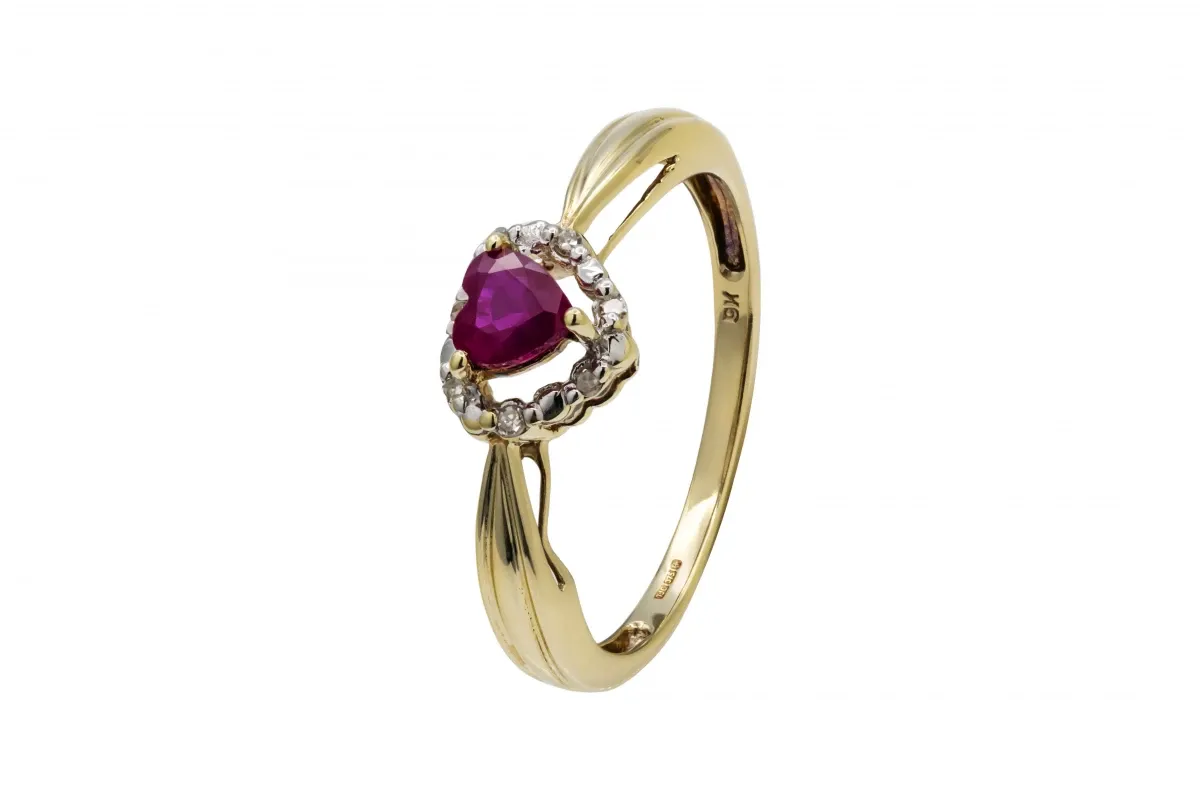 This 9ct Yellow Gold Heart-Shaped Halo Ring features a 0.15ct ruby surrounded by a 0.08ct diamond halo, offering a charming and romantic design.