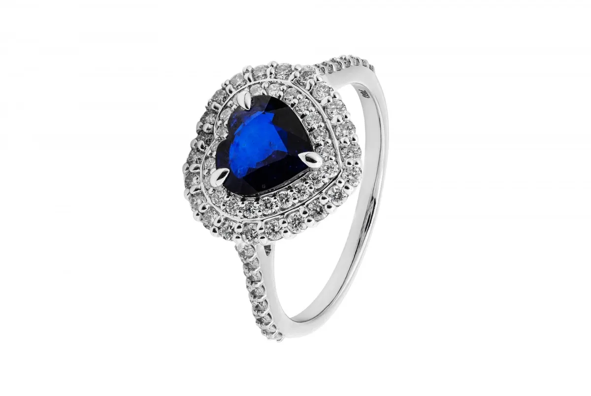 This stunning 18ct white gold ring features a double halo design adorned with diamonds and a heart-shaped sapphire.